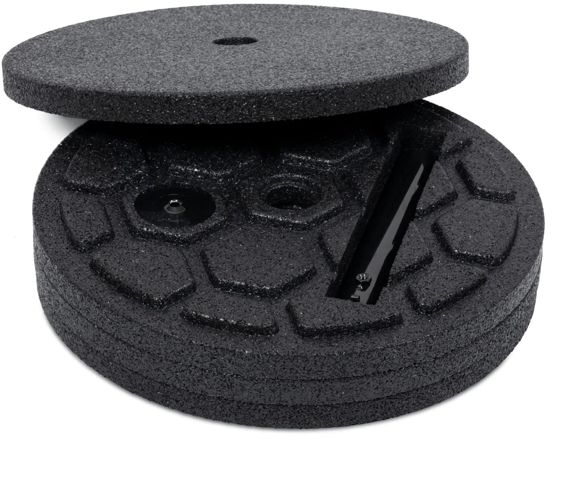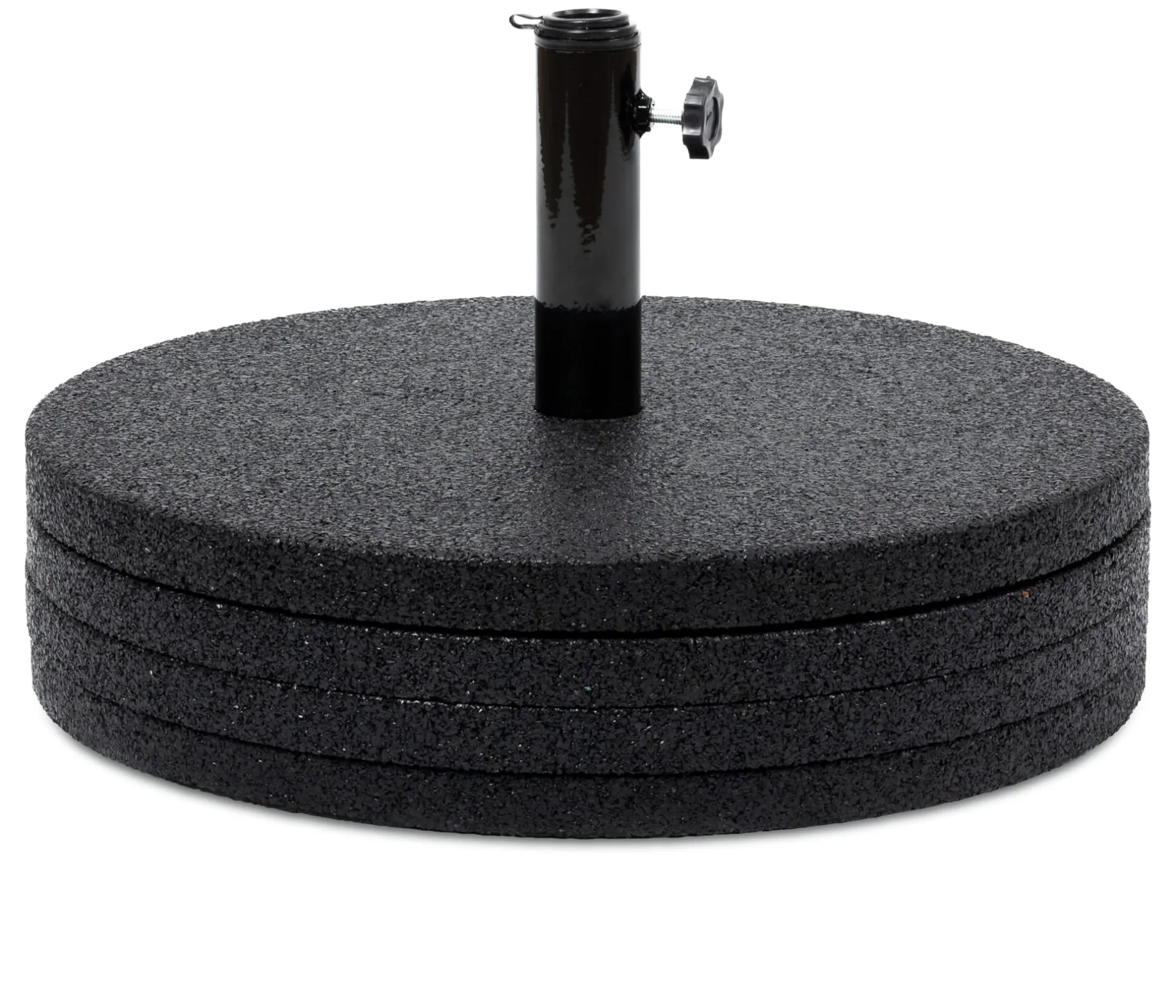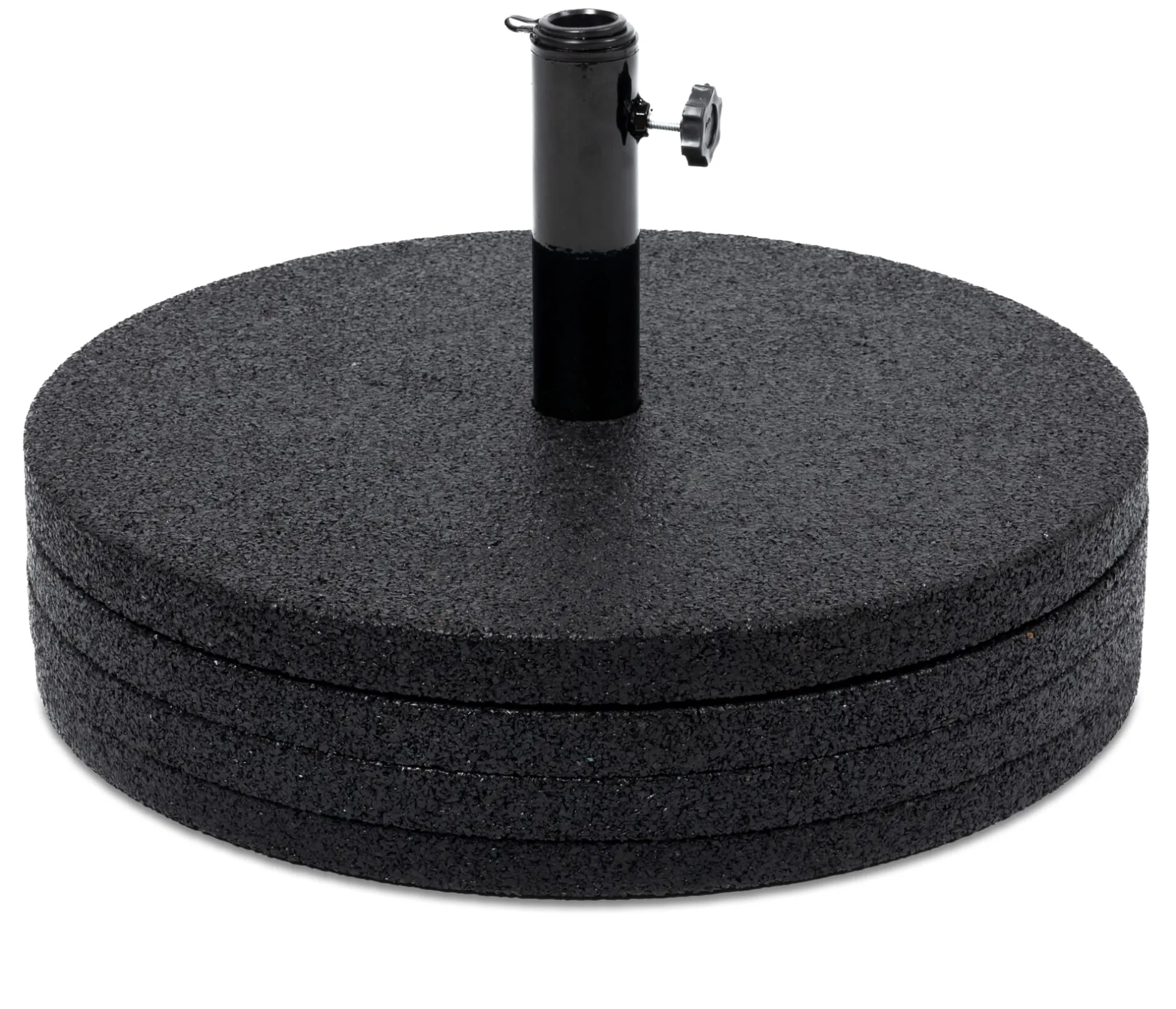Sonnenschirmständer aus einem ungewöhnlichen Material: KAMI besteht aus komprimiertem Altgummi recycelter Autoreifen. Die vier Scheibensegmente werden formschlüssig übereinandergestapelt. Einzeln lassen sie sich mühelos bewegen, zusammen wiegen sie dann immerhin 17 kg. Der stählerne Schaft nimmt Sonnenschirme mit einem Durchmesser von bis zu 39 mm auf. KAMI ist ideal konzipiert für den Einsatz unter Gartentischen mit Loch. Der Schirmständer ist praktisch zu handhaben, bequem zu platzieren, schnell abzubauen und zu verstauen. Das Material schont empfindliche Terrassenbeläge und ist wetterfest.