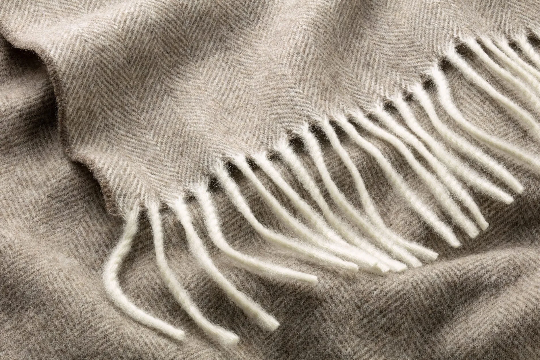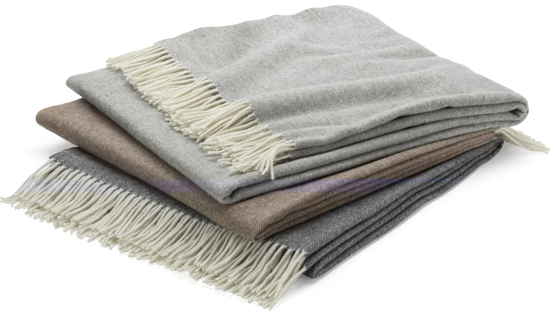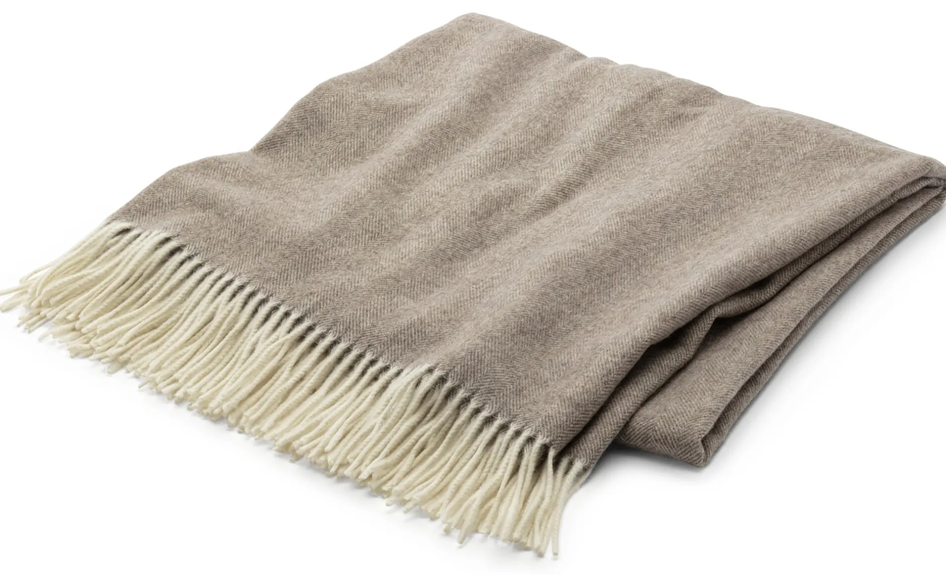 100% Schurwolle. Faserfeinheit 21 Mikron. 130 × 190 cm inkl. der 9 cm langen Fransen. Gewicht 600 g.