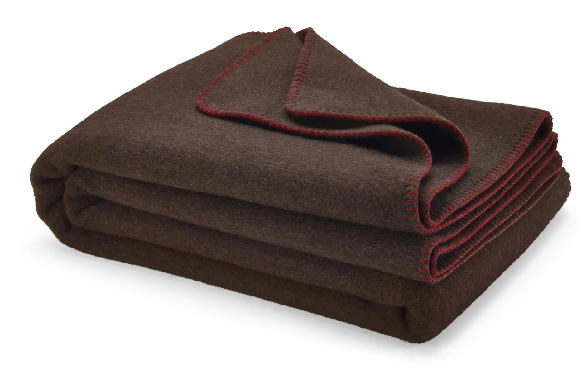 Diese Decke ist aus reinem, naturbelassenem Yakhaar gewebt. Ungefärbt und ungebleicht zeigt das Haar seine natürliche braune Farbe und ist mit einer Faserfeinheit von 18,5 bis 21 Mikron überaus fein und weich. Auch hier werden nach dem Weben beide Seiten mechanisch angeraut und die Kanten mit (hier rotem) Baumwollgarn umkettelt. Gefertigt wird die Yakhaardecke in Deutschland.