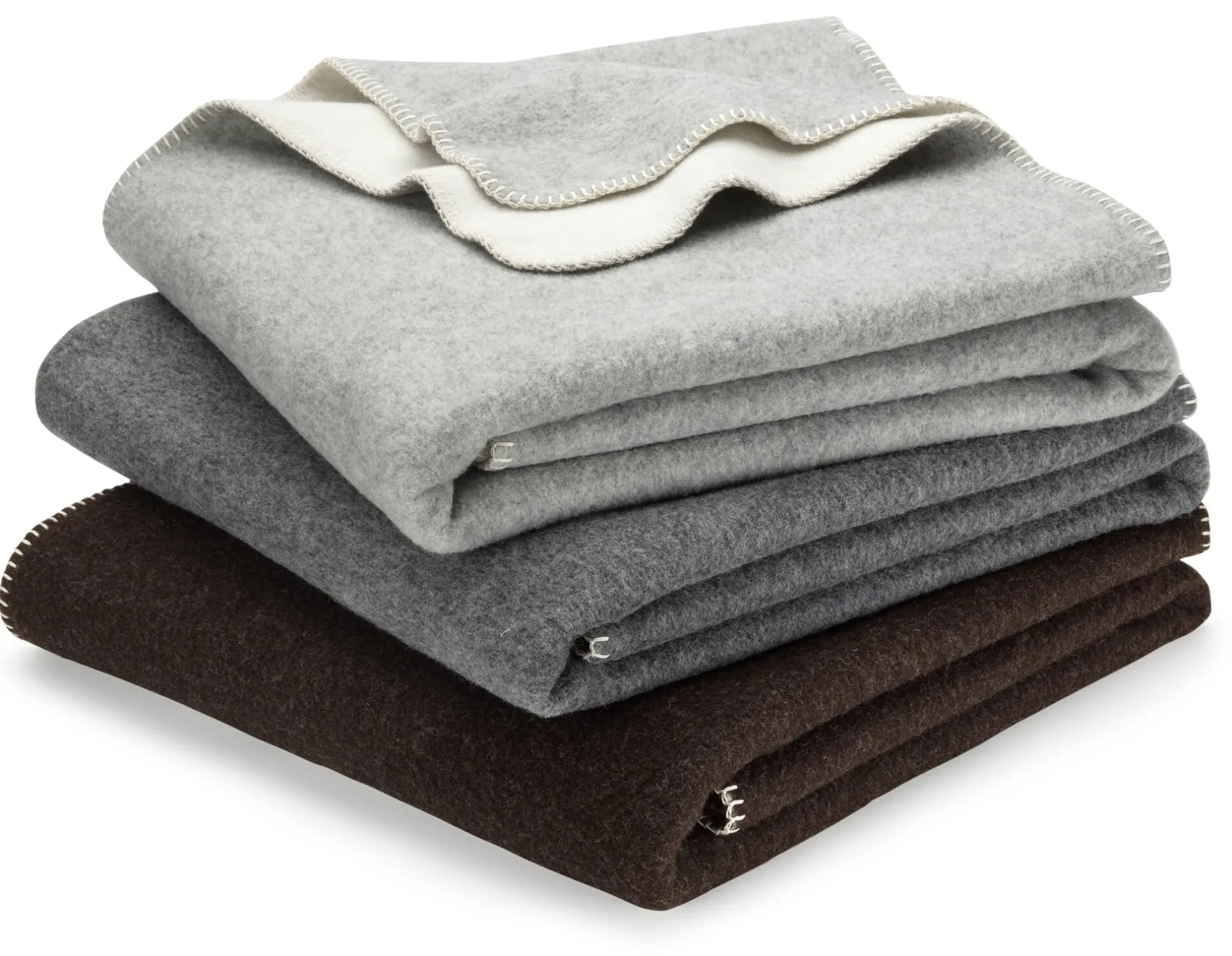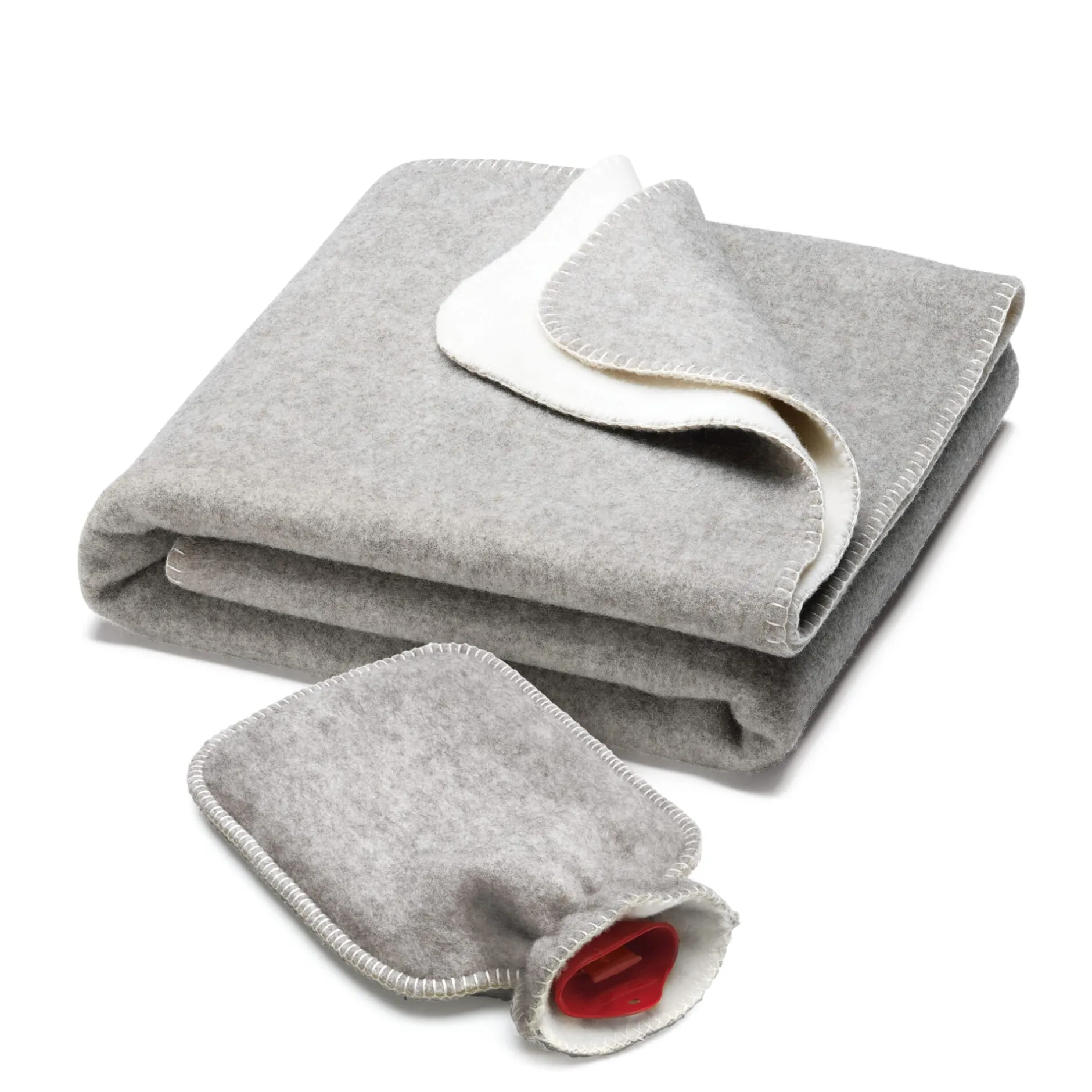 Diese Doubleface-Decken entstehen vollständig in Deutschland – vom Spinnen über das Weben und Färben bis hin zum Waschen, Rauen und Ketteln –, auch die Schurwolle stammt von deutschen Schafen. Um größeres Volumen und noch mehr Weichheit zu erzeugen, wird der Doubleface gewaschen und die Gewebeoberfläche zusätzlich angeraut: auf mit Naturdisteln bestückten Rollkarden-Raumaschinen. Die Kanten und die abgerundeten Ecken sind sorgfältig mit einem festen Kettelstich versehen. Die Decke hat einen so weichen Fall, dass sie auch schon mal ein Oberbett ersetzen kann. Passend zu den beiden Decken in Anthrazit und Grautönen lassen wir aus dem gleichen Material einen temperaturausgleichenden Flaschenbezug fertigen.