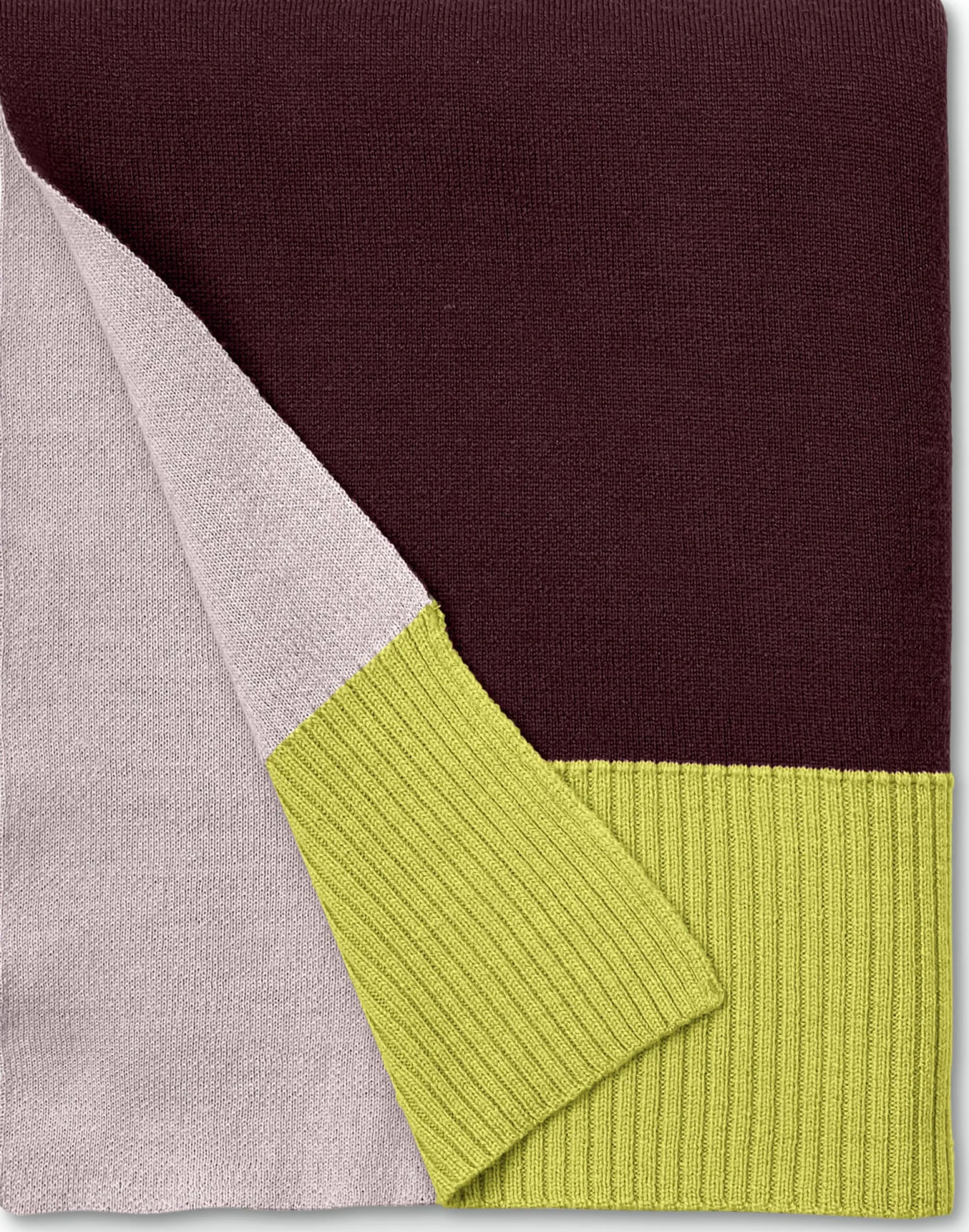 Doppelseitig gestrickte Decke aus 100% Merinowolle in kräftigen Blockfarben – auffällig mit ihren unterschiedlichen Farben auf beiden Seiten, die gekonnt aufeinander abgestimmt sind. Schönes Detail: Das breite Rippbündchen in kontrastierender Farbe ist beiden Seiten gemein. Ideal für einen entspannten Abend zu Hause oder als farbstarkes Detail am Fußende des Bettes.