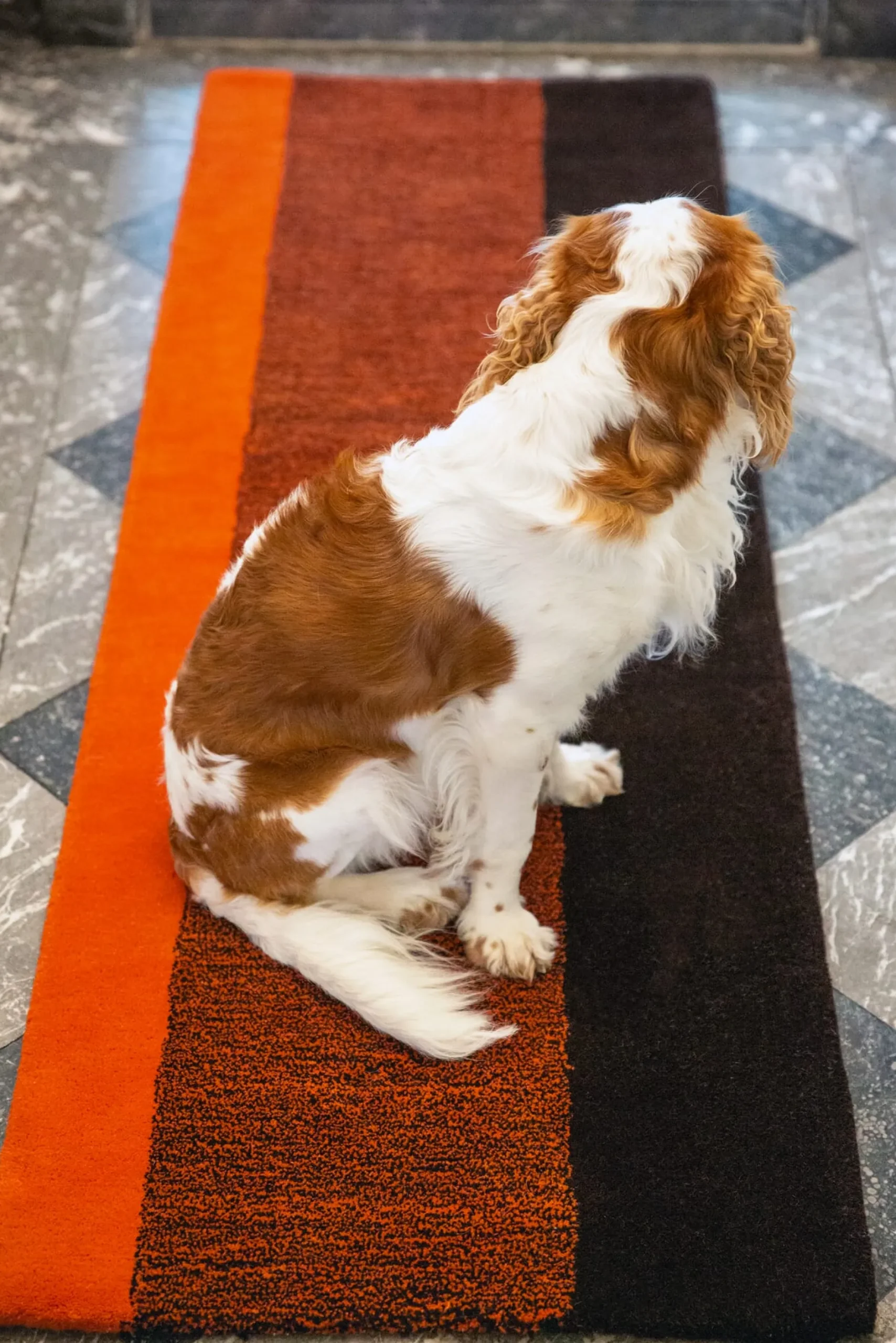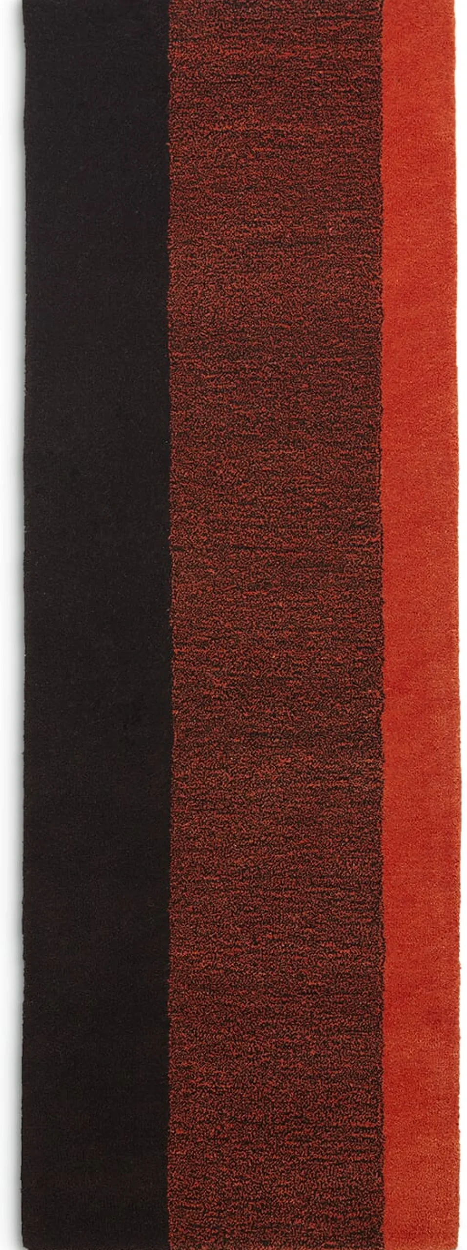 Teppichkollektion aus reiner Wolle, entworfen vom niederländischen Designer Lex Pott für Suite702. Die Teppiche tragen jeweils drei farbige Streifen. Die beiden äußeren Streifen sind in zwei unterschiedlichen Farben gestaltet, die sich im mittleren Streifen vermischen. So entsteht ein harmonischer Übergang zwischen den Farbbereichen. Ideal neben dem Bett oder im Flur. Auch für Barfußläufer geeignet, da schön weich und hochflorig.