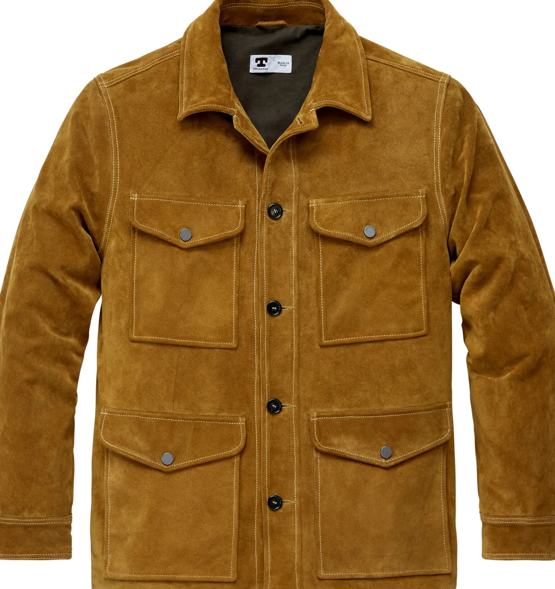 Charaktervolle und durchaus schwere Jacke aus einem weichen, 2,5 mm starken Kalbveloursleder, das in dieser Farbstellung bei Tellason „silky gold“ heißt. Das Rumpffutter besteht aus hautsympathischer Baumwolle, die Ärmelfutter aus Viskose erleichtern das An- und Ausziehen. Die Jacke wird mit Echthornknöpfen geschlossen. Außen sind vier Pattentaschen mit Messingdruckknöpfen aufgesetzt, wobei unter den unteren Taschen noch zwei Schubtaschen liegen. Innen ist eine ebenfalls knöpfbare Innentasche eingesetzt.