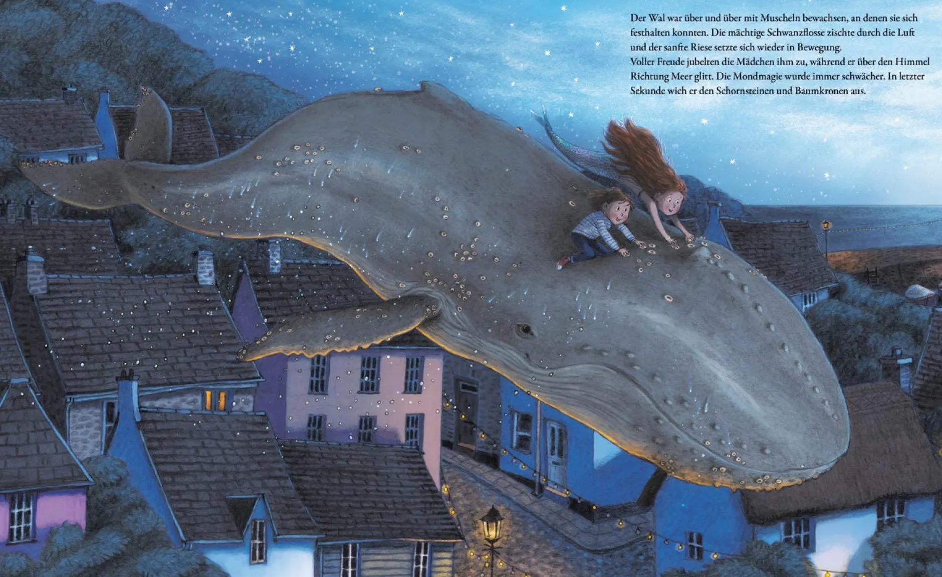 Mia hat, wovon viele träumen: eine echte Meerjungfrau als beste Freundin! Molly lebt nur einen Kieselwurf entfernt in der kleinen Bucht, wo die beiden nach verborgenen Schätzen tauchen oder mit Delfinen schwimmen. Aber Molly war noch nie an Land. Bis zur Nacht des magischen Mondes, in der alle Meeresbewohner wie durch Zauberhand durch die festlich geschmückten Straßen schwimmen können! Wie stolz Mia ist, Molly zum ersten Mal ihr Zuhause zu zeigen und mit ihr hoch in den Himmel zu schaukeln! Doch bevor der Mond das Meer berührt, muss Molly wieder zurück im Meer sein, sonst erlischt die Magie für immer. Als Mia in Not gerät, muss die kleine Meerjungfrau eine Entscheidung treffen … Mit ihrer herzerwärmenden Geschichte und den tollen atmosphärischen Bildern entführt Briony May Smith in eine verzauberte Welt, in die man beim Vorlesen und Zuhören wunderbar abtauchen kann. Mit Mia und Molly erleben Mädchen, Jungen und die ganze Familie ein ebenso emotionales wie magisches Freundschaftsabenteuer, das noch lange nachwirkt.