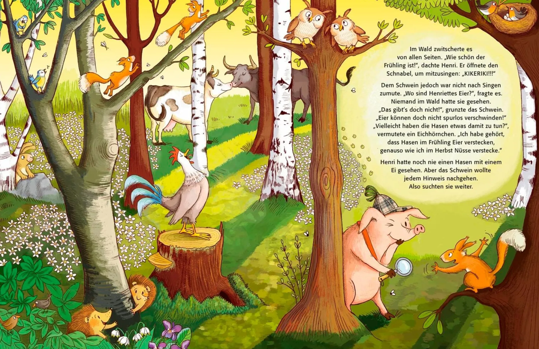 Wenn Ostern vor der Tür steht, dann haben Hase und Huhn so einiges vor. Der alte Osterhase Kuni hat dieses Jahr völlig verschwitzt, rechtzeitig die Eier zu bemalen. Nun muss die Haselmaus Hasel kreativ werden, damit das Fest nicht ins Wasser fällt. Henri und Henriette bekommen einen Schreck, als plötzlich alle ihre Eier verschwunden sind. Gemeinsam suchen sie den Bauernhof ab und finden eine große Überraschung. Die kluge Henne Elli Erbse hat eine famose Idee, wie sie ihre Eier behalten und den Kindern trotzdem eine tolle Osterüberraschung ins Nest legen kann. Und die kleine Lilly Puschel gewinnt den alljährlichen Osterhasen-Wettbewerb mit einer gehörigen Portion Mut.