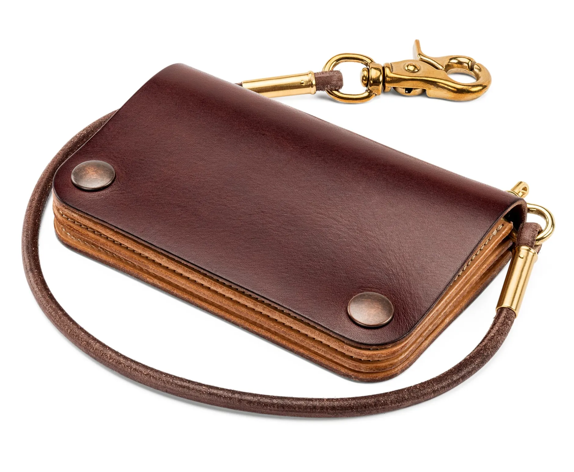 Diese Geldbörse aus vegetabil gegerbtem Rindleder ist wie eine klassische Bikerbörse gearbeitet – mit dem Unterschied, dass sie nicht über eine Kette, sondern über ein kräftiges Rundlederband von 6 mm Durchmesser und einen imposanten Messingkarabiner an Gürtelschlaufe, Gürtel oder Tasche gesichert wird. Das Lederband selbst ist über einen soliden Messingschäkel mit der Börse verbunden.