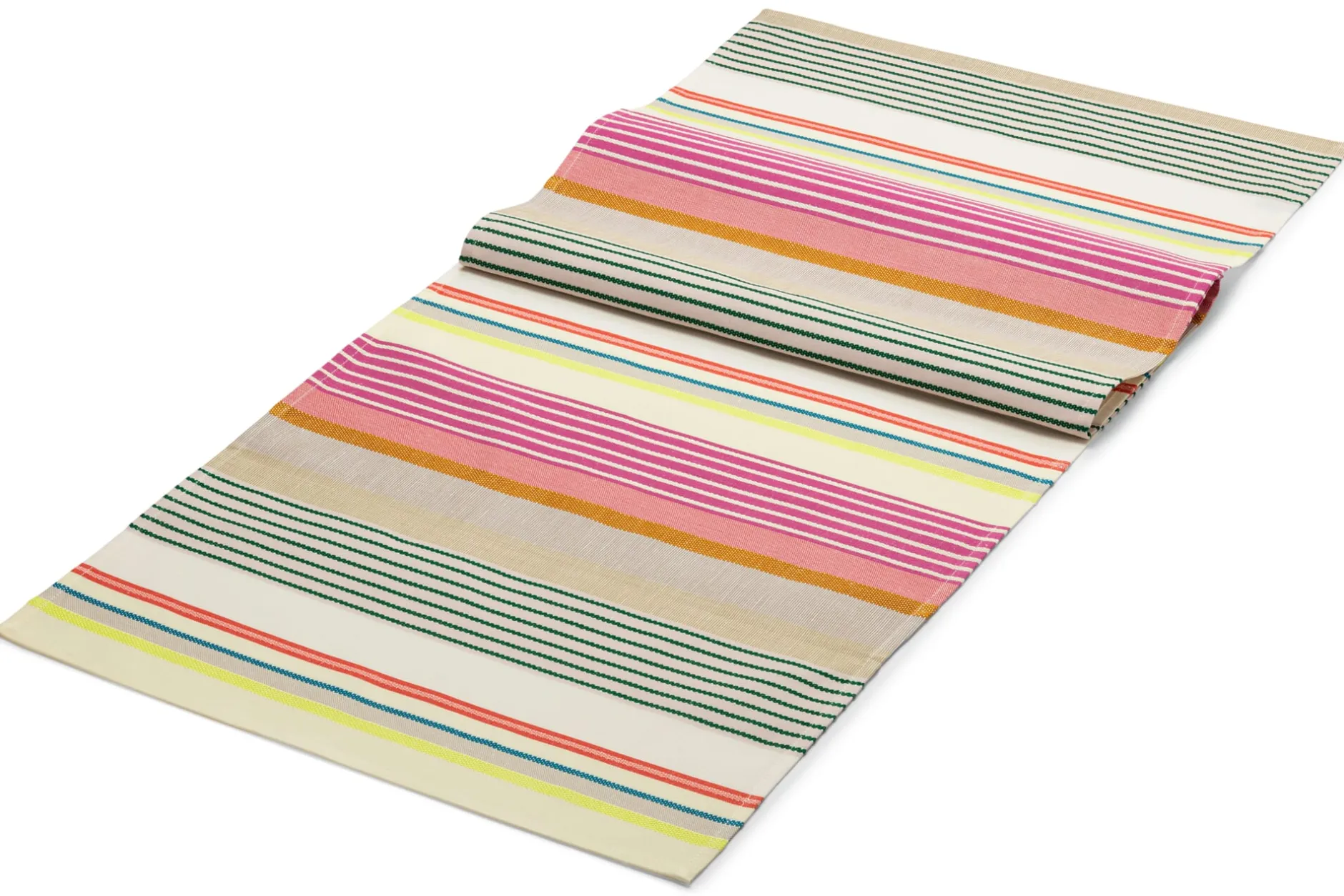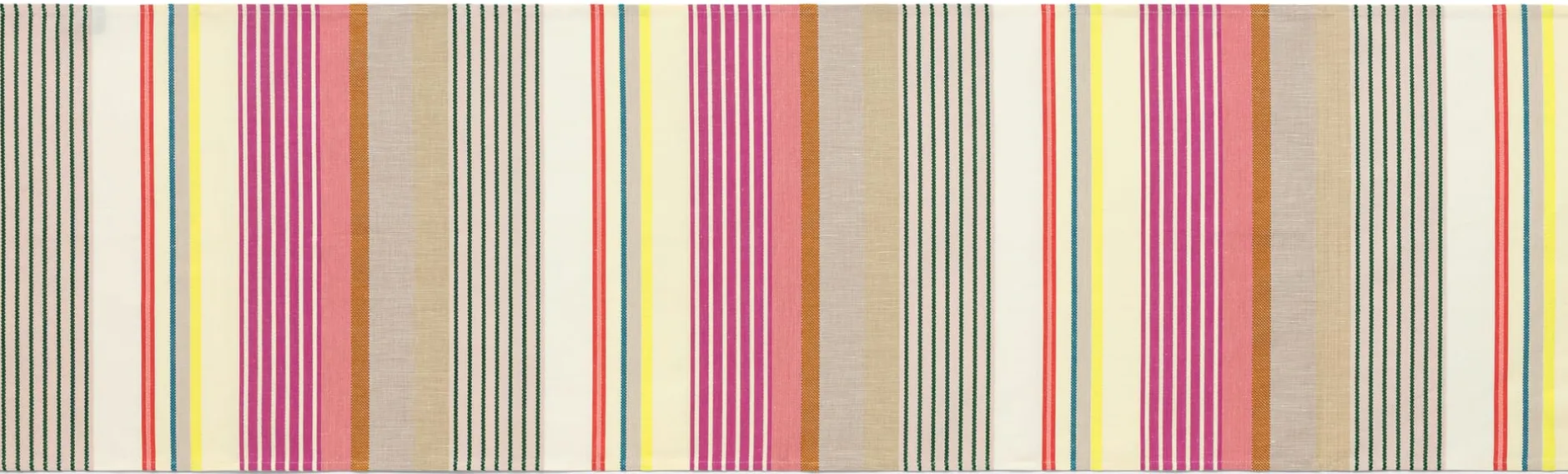 Die fröhlich bunten Streifen auf diesem Tischläufer holen uns den Sommer in Küche und Esszimmer und versetzen uns in richtig gute Laune. Die bleibt auch, wenn einmal etwas danebengeht, denn das Gewebe wird aus 60 Prozent kbA-Baumwolle und 40 Prozent strapazierbarem Leinen gefertigt und darf in die 60-Grad-Wäsche. Und falls Sie wie wir gar nicht genug von den farbigen Streifen bekommen können: Wir bieten auch ein Tischset und Kissenbezüge aus dem bunten Stoff an.