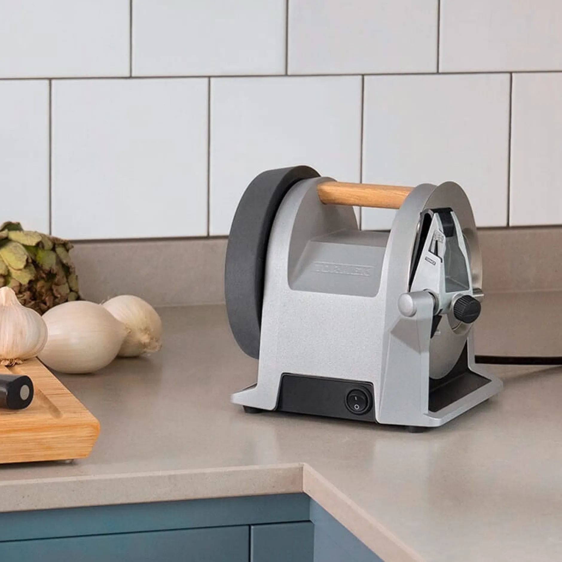 Ausgestattet ist sie mit einer langsam laufenden feinkörnigen Diamantschleifscheibe für einen besonders schonenden Schleifvorgang. Zusätzlich besitzt sie eine Abziehscheibe zur finalen Entgratung der Klingen. Mit minimalem Materialabrieb hält sie Messer mit allen Stählen gut in Form und macht jedes Messer lange haltbar. Viele herkömmliche Methoden schärfen das Messer nicht vollständig, sondern begradigen nur die Schneide, schärfen nur Teile der Schneide oder entgraten. Bei vielen Methoden, wie zum Beispiel der Anwendung eines Wetzstahls, besteht die Gefahr der Beschädigung der Schnittflächen. Wer’s also ernst meint mit seinen Messern und die Funktion der wichtigsten Werkzeuge in der Küche immer auf dem besten Stand halten möchte, für den ist die T-1 die ideale Ergänzung der Messersammlung.