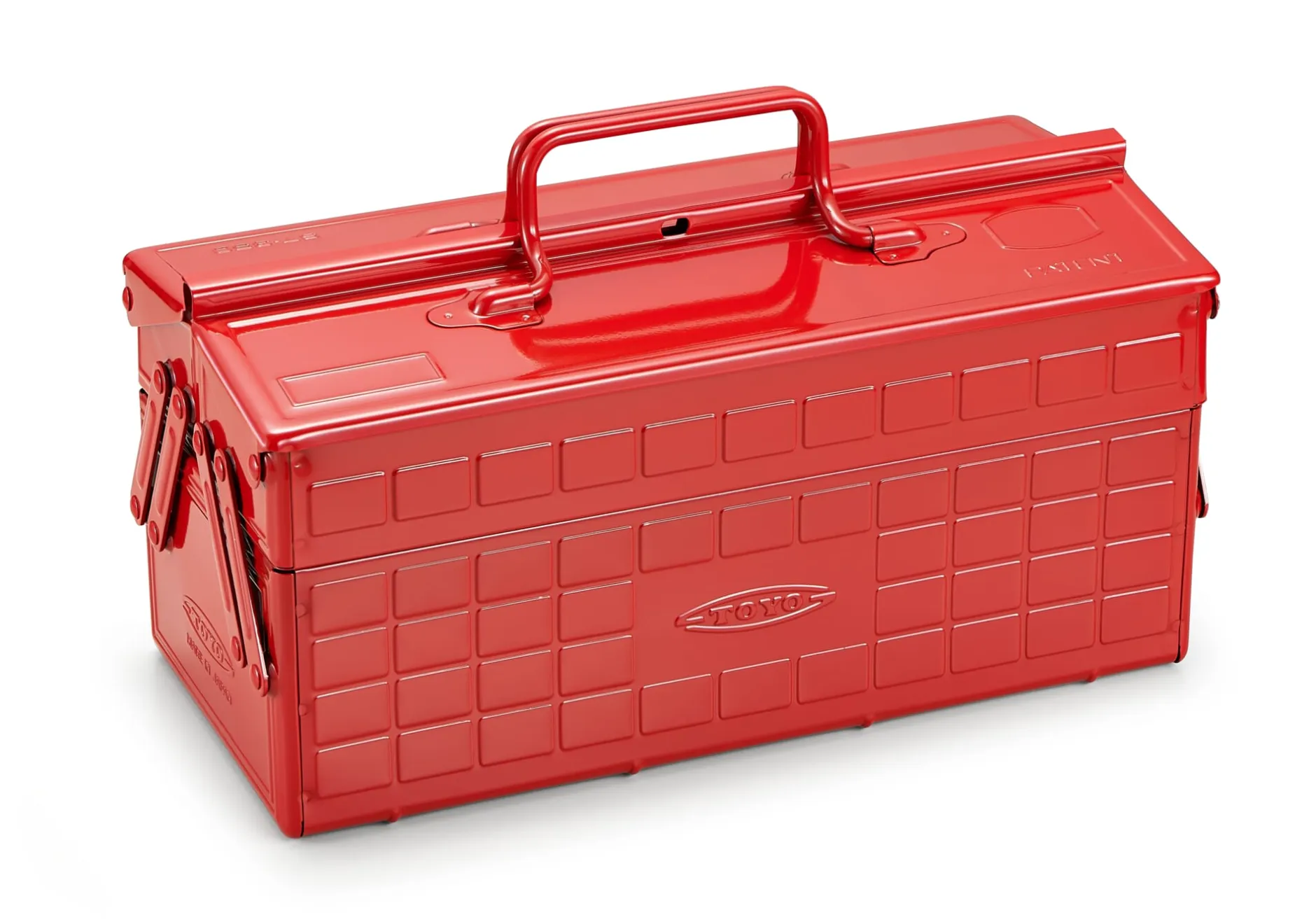Die perfekte Werkzeugkiste – aus Japan von Toyo Steel: praktisches, schmales Format, schweißnahtloser Aufbau der Grundstruktur, hohe Wandstärke des Stahlblechs. Die geprägte Waffelstruktur an Innen- wie Außenseite verleiht dem Stahlblech zusätzliche Stabilität und Robustheit. Vier lose einsetzbare Metalleinteilungen unterteilen die obersten beiden Fächer. Im geöffneten Zustand wird das unterste Fach komplett freigegeben, die Werkzeuge sind so bestens greifbar. Wegklappbare Griffe, zwei Deckelösen ermöglichen das Abschließen des Werkzeugkastens. Für vielerlei Kleinkram – nicht nur für Werkzeug.