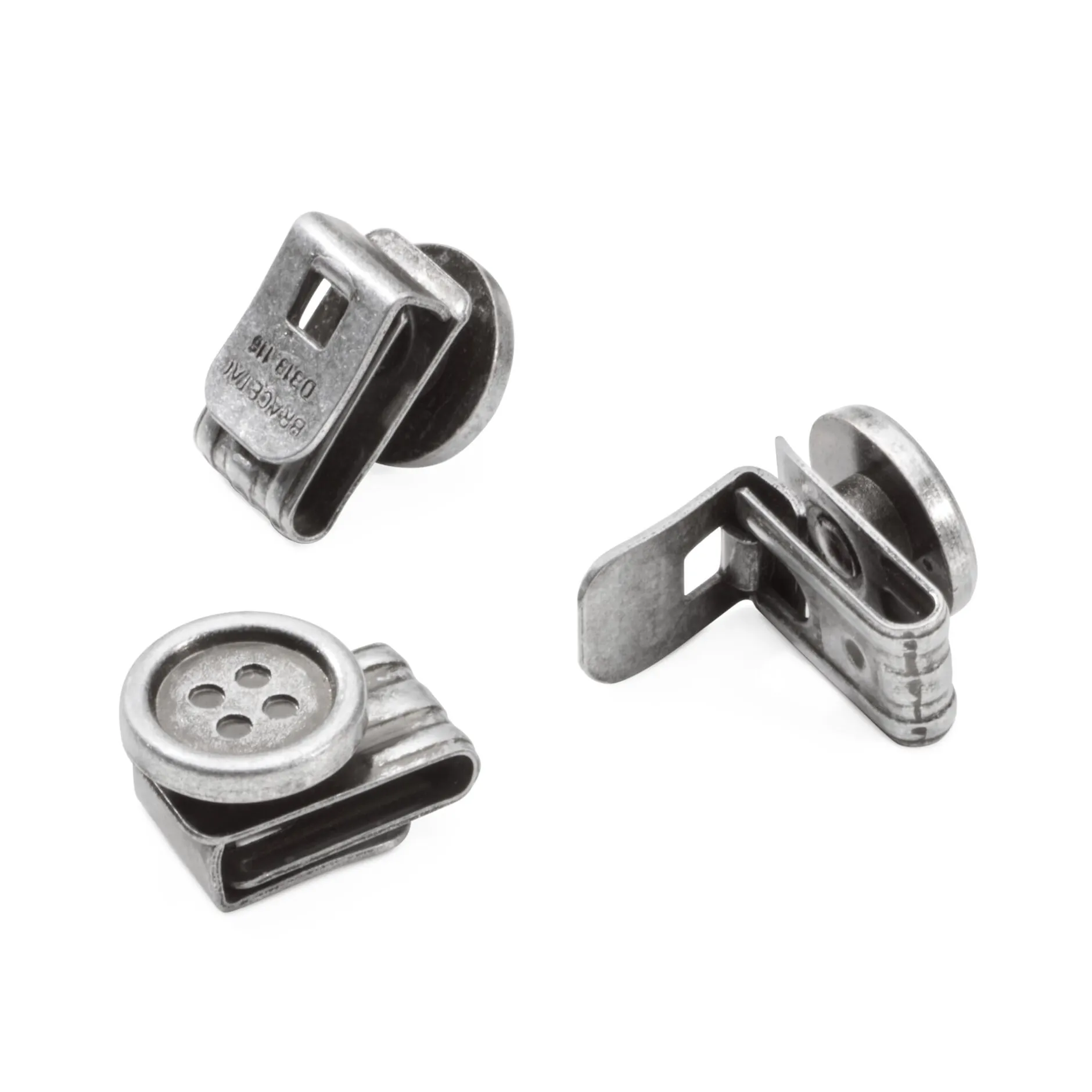 Diese praktischen Clipknöpfe sind für Hosen, die nicht bereits mit jenen Knöpfen ausgestattet sind, an die ein anständiger Hosenträger anknüpfen könnte. Sie sind aus solidem Zinkdruckguss gearbeitet und werden einfach am Hosenbund eingeklipst.