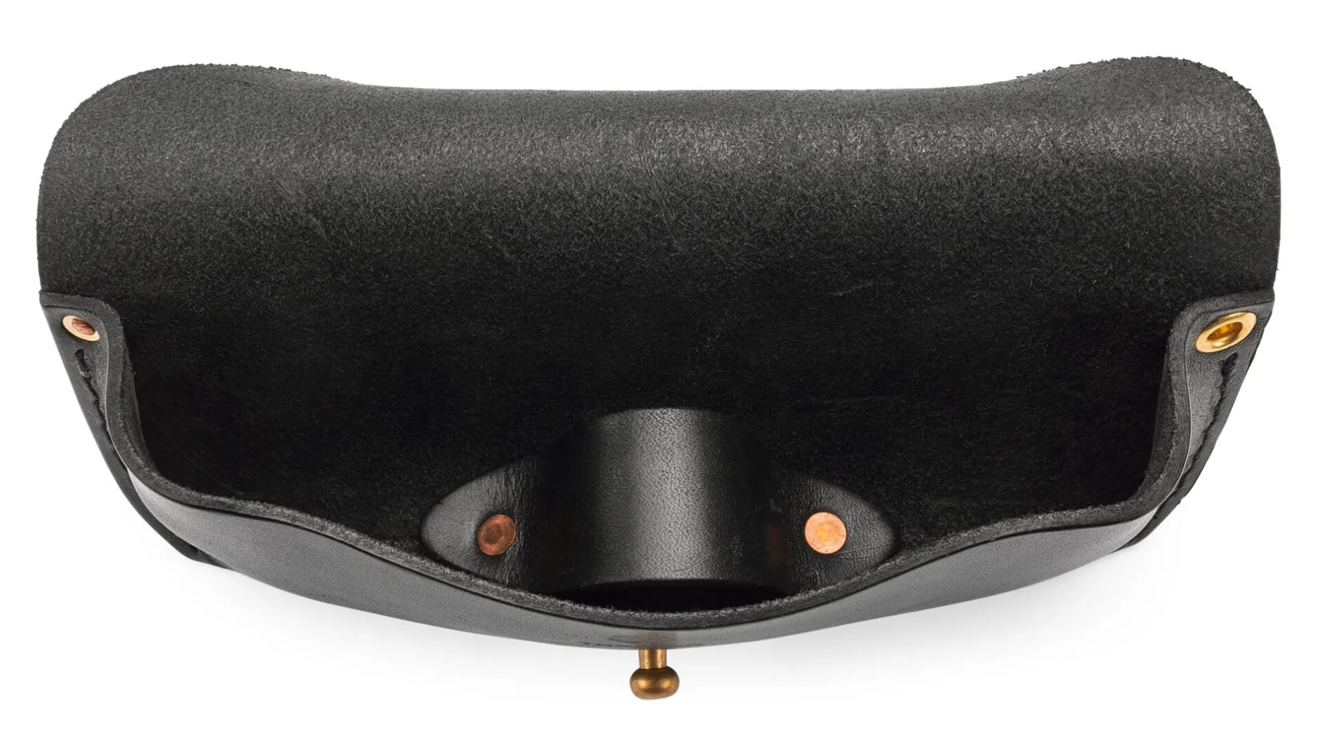 Ein kleines Kunststück ist es, in einer ledernen Hülle fragilen Inhalt vor Stößen und stärkerem Druck gut zu schützen, selbst für solch ein stabiles Brillenetui, das aus ca. 2,5 mm starkem, robustem Rindleder gefertigt ist. Ausnahmsweise nicht auf der Hand, sondern auf der Nase liegt die Lösung für diese Herausforderung – einfach, aber effektiv: Im Innern des Etuis ist im Boden eine „Nase“ vernietet. Dieser feste, wie ein Nasenrücken gewölbte Ledersteg gibt der Brille nicht nur Halt, sondern fungiert vor allem als Abstandhalter und stabilisiert das Etui, wenn es mit Patronentaschenknopf verschlossen wird. Solide vernäht, bewahrt es auch bei stärkerer Beanspruchung Form und Inhalt. Und zugleich ist es geräumig genug, um auch ausladendere Modelle von (Sonnen-)Brillen aufzunehmen. Die Stahlöse am Übergang vom Etuikörper zur Verschlusslasche erlaubt es, ein (Trage-)Band zu befestigen.