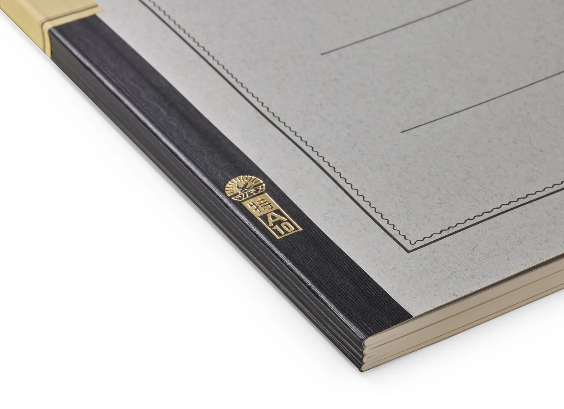 200 Seiten starkes Notizheft im A4-Format, mit 30,5 × 21 cm jedoch 8 mm höher als DIN A4. Es besteht aus 4 fadengehefteten Heften, die mittels des Kartoneinbandes und des Fälzelbandes fest miteinander verbunden sind. Glattes, zartweißes Naturpapier (85 g/qm), randabfallend liniert (Abstand 8 mm), mit einer Kopfzeile aus roten Linien. Kartonumschlag, schwarzer Fälzelstreifen mit einem quer über den Rücken laufenden Papieretikett, einem für japanische Schreibhefte typischen Detail. Aus Japan.