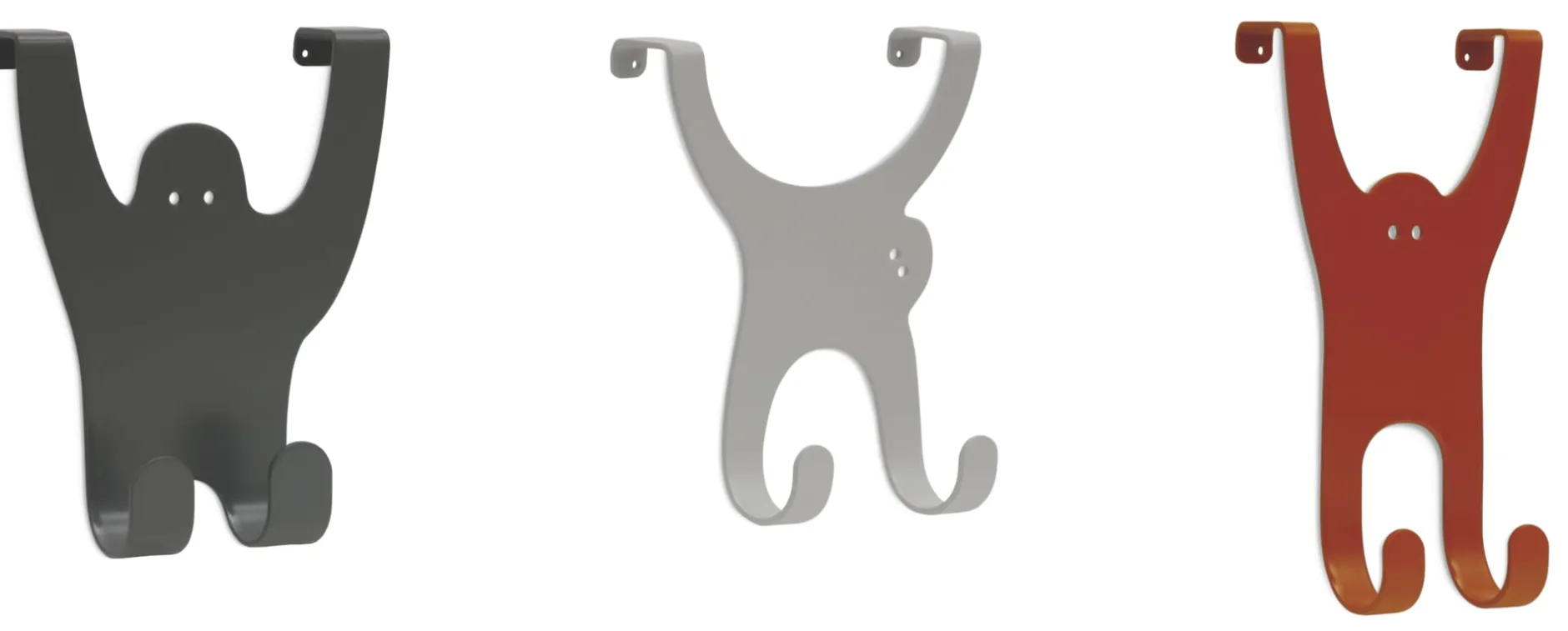 Die Affenbande bietet ihre langen Gliedmaßen zum einen als Haken und zum anderen als sichere Halterung an Standardtürblättern (bis ca. 18 mm) an. Das Set besteht aus einem Gorilla, einem Orang-Utan und einem Gibbon. Drei in der Form von Affen gelaserte und gefaltete Blechformteile in drei verschiedenen Farben.