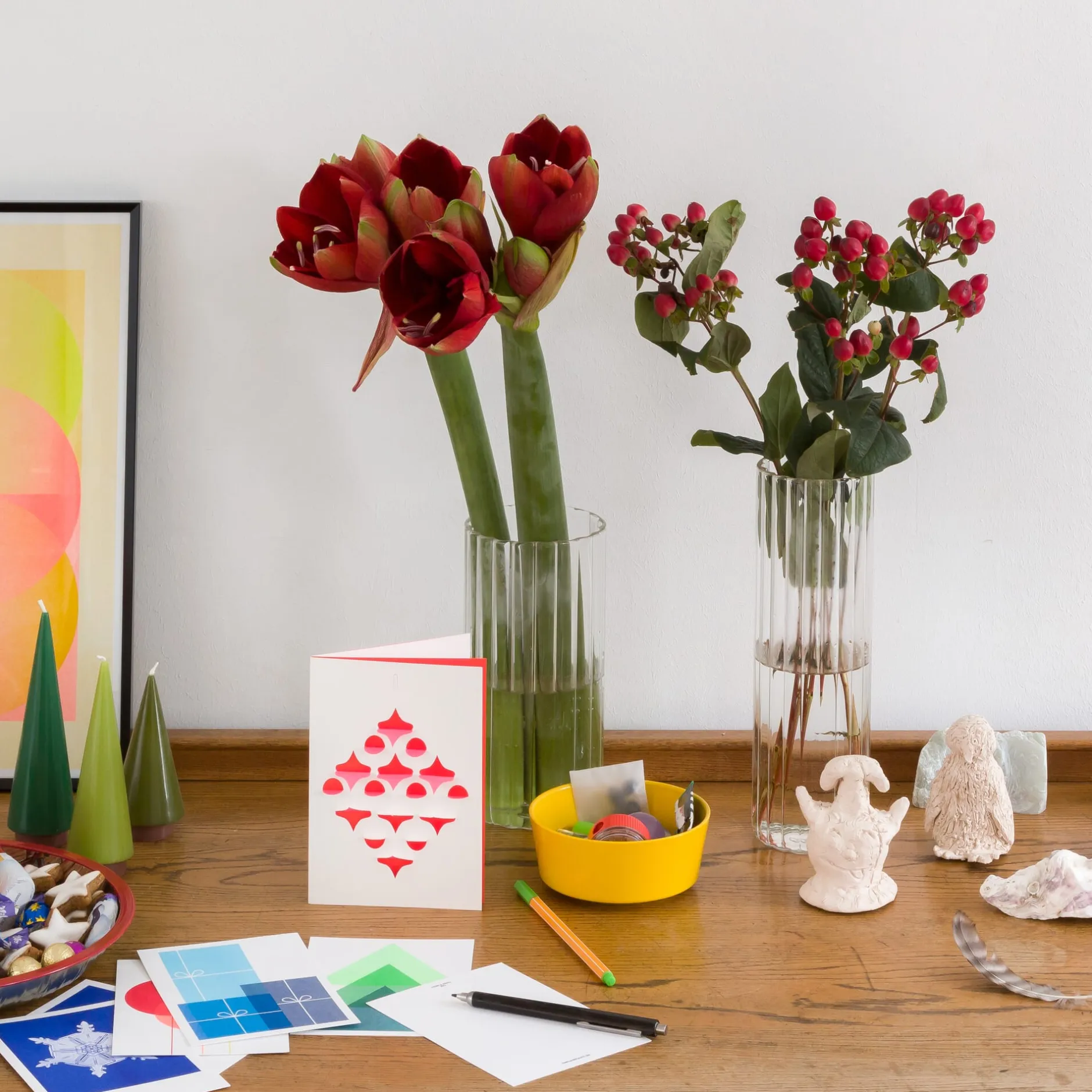 Schön technisch und mit interessantem optischem Effekt: Vasen aus gewelltem, industriell vorgefertigtem Borosilikatglas. Die gläsernen Strangprofile werden in einem handwerklichen Prozess eingekürzt und durch Verschmelzen des Materials verschlossen. Durch die im Innern des Behälters verlaufende Rillung, lassen sich Blumen und Sträuße gut und stabil in Form bringen. Spülmaschinengeeignet.