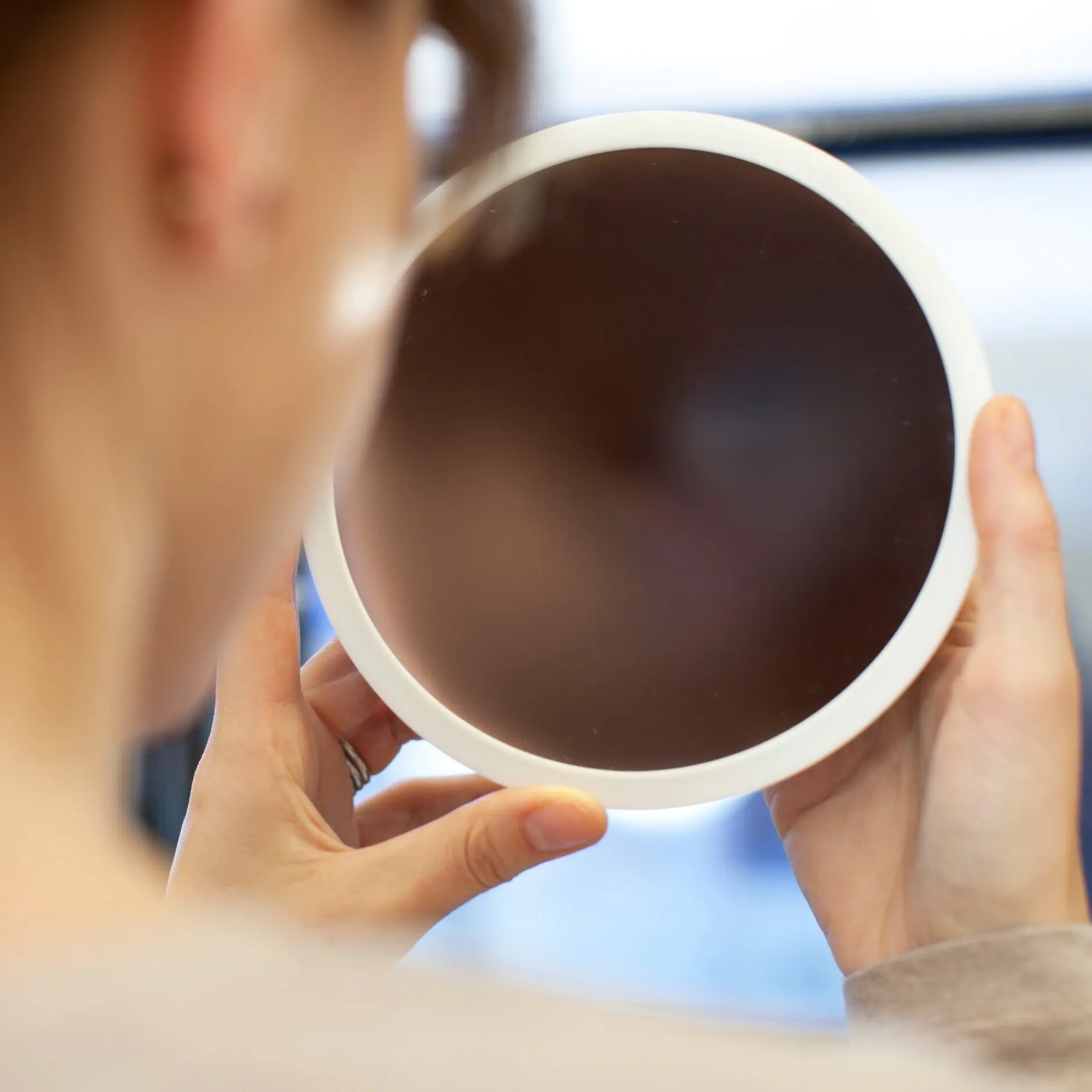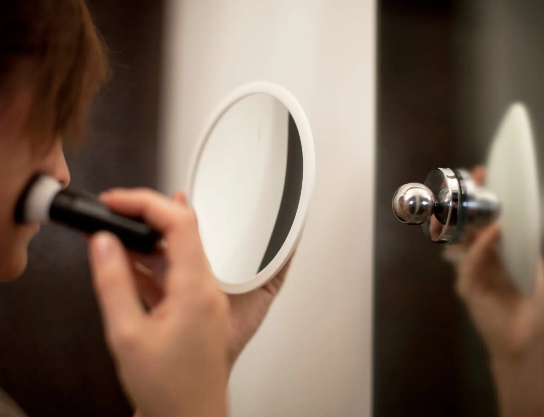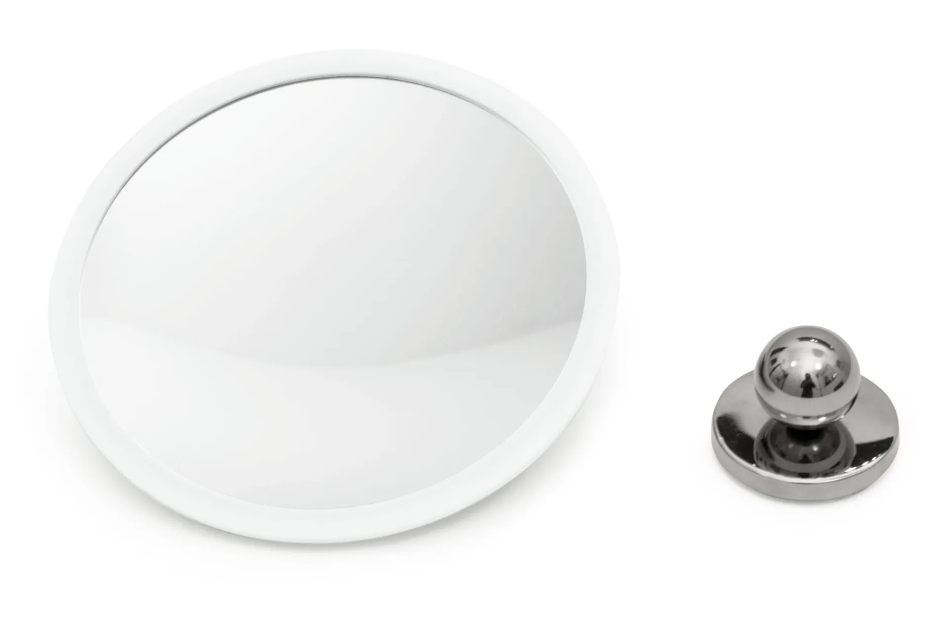 Vergrößerungsspiegel in großer Version und in zwei verschiedenen Optiken: AIR besitzt einen per Saugnapf zu fixierenden Fuß aus Edelstahl, dessen Kugelausschnitt formschlüssig in die Rückseite des Spiegels greift. Beide Teile sind von einem Magneten gehalten, lassen sich gegeneinander verschieben und somit in jede gewünschte Position drehen. AIR lässt sich leicht auf vielerlei Oberflächen, wie glatte Keramik, Spiegel, Metall und anderen, per Saugnapf fixieren.