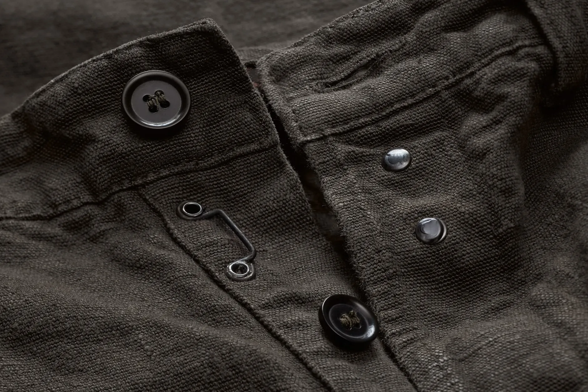 100% Leinen. Kunststoffknöpfe, Metallhaken und -öse. Hergestellt in Frankreich. Innenbeinlänge 84 cm.