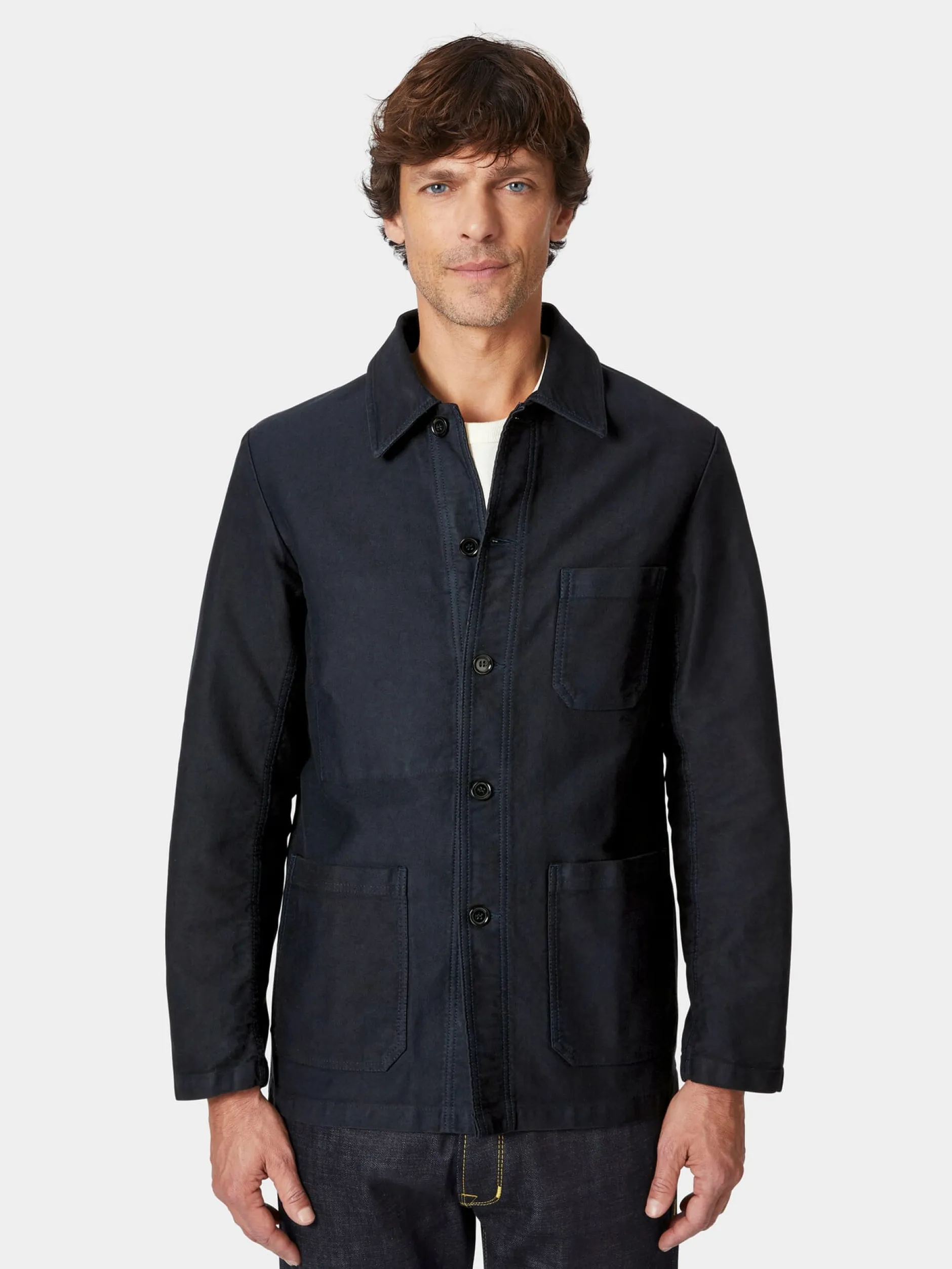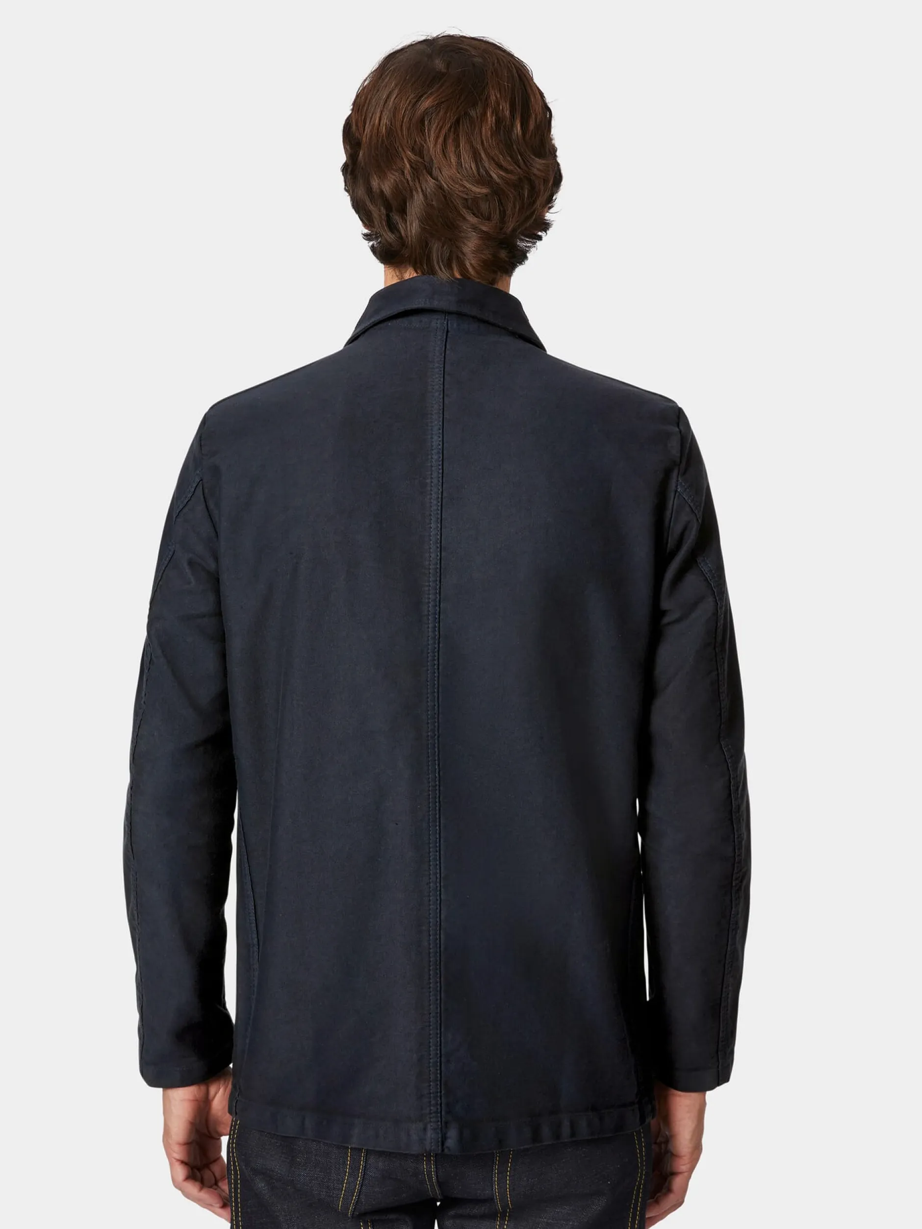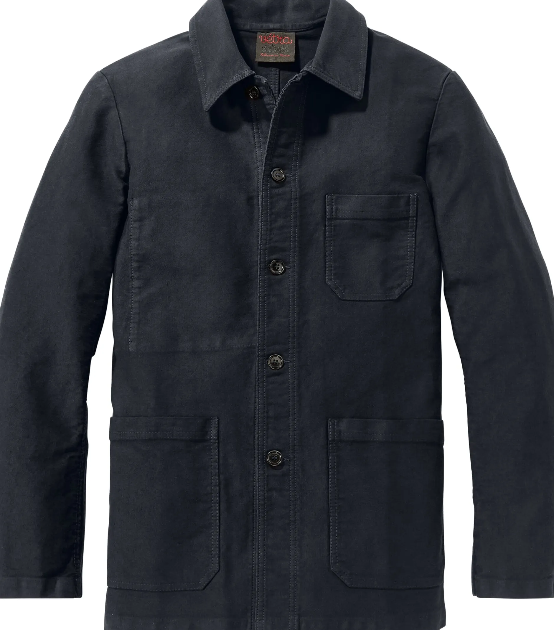 Aus einem Moleskin französischer Machart, der weiter abgeschoren und damit kurzfloriger als andere derartige Gewebe ist, konfektioniert Vetra diese Jacke. Der Schnitt mit den zwei großen aufgesetzten Taschen, der aufgesetzten Brusttasche und einer Innentasche greift die Form einer traditionellen Arbeitsjacke auf.