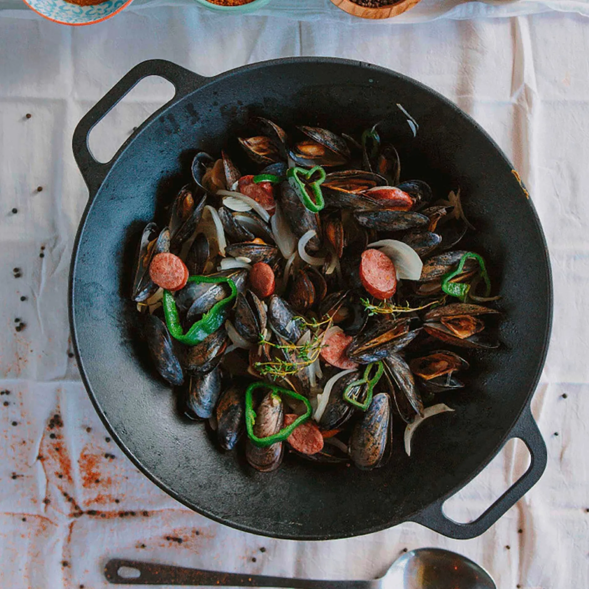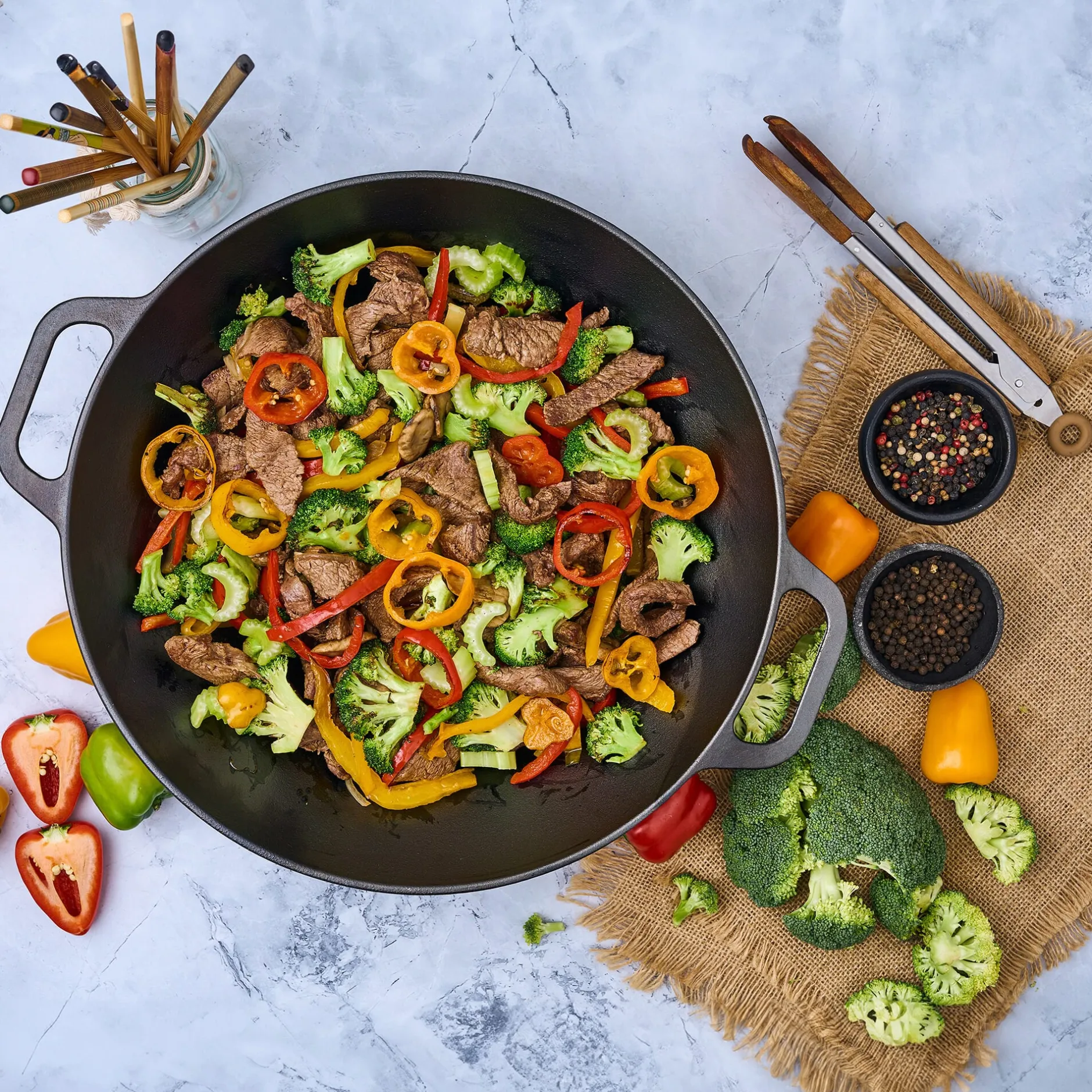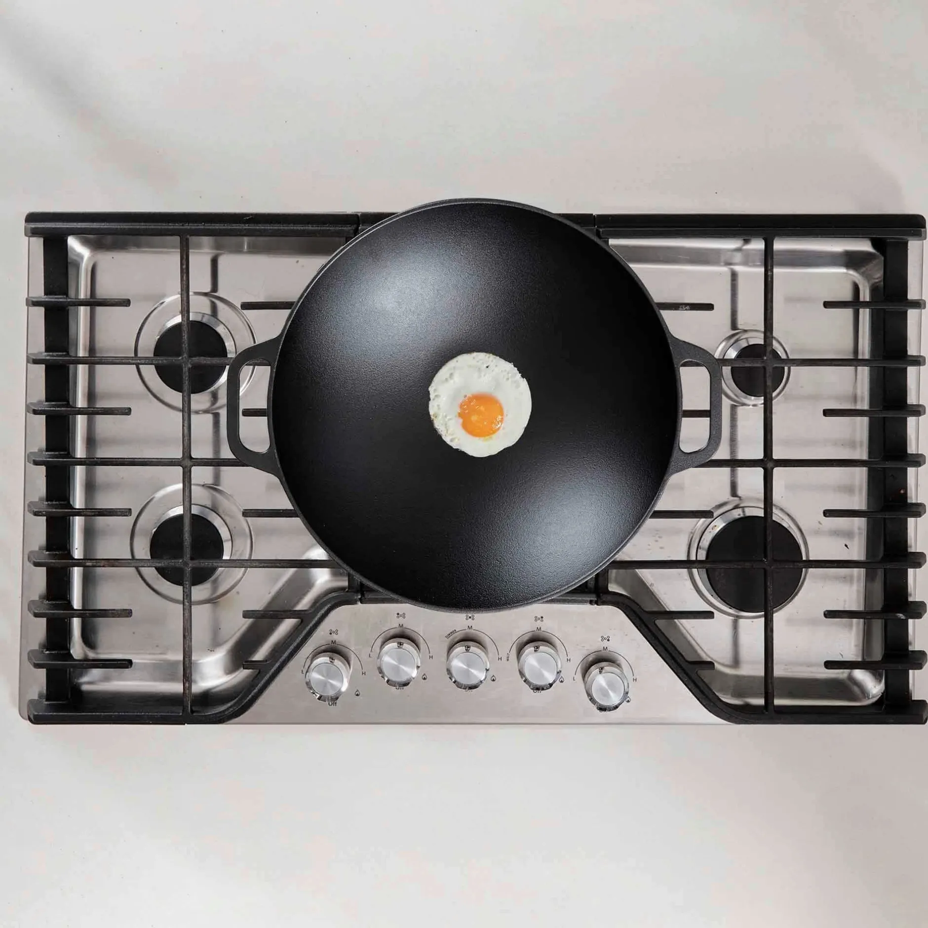 Wie für (fast) jedes andere Material gilt auch für Gusseisen: je massiver, desto ausgeglichener die Reaktion auf Wärmezufuhr. Das betrifft die Verteilung genauso wie das Speichern von Wärme. Gusseisen gibt, wenn Sie so wollen, ein hervorragendes Speichermedium ab und ist daher für Anwendungszwecke wie diesen ideal geeignet – denn beim Garen von Gemüse, Fleisch und Ei im Wok kommt es schließlich genau auf diese beiden Dinge an: dass die zugeführte Wärme vom Boden bis an den oberen Rand des Kochgefäßes gleichmäßig verteilt wird, und dass das Gefäß während der gesamten Dauer des Garvorganges rundherum warm, wenn nicht sogar heiß, bleibt. Die bestgeeignete Wärmequelle ist der Gasherd, Sie können unseren gusseisernen Wok aber auch auf E-Herd oder Grill einsetzen. So groß und schwer wie er ist, eignet er sich perfekt fürs Kochen mit (oder für) Besuch. Unser Tipp: Probieren Sie doch mal ein cremig gerührtes Risotto vom Grill!