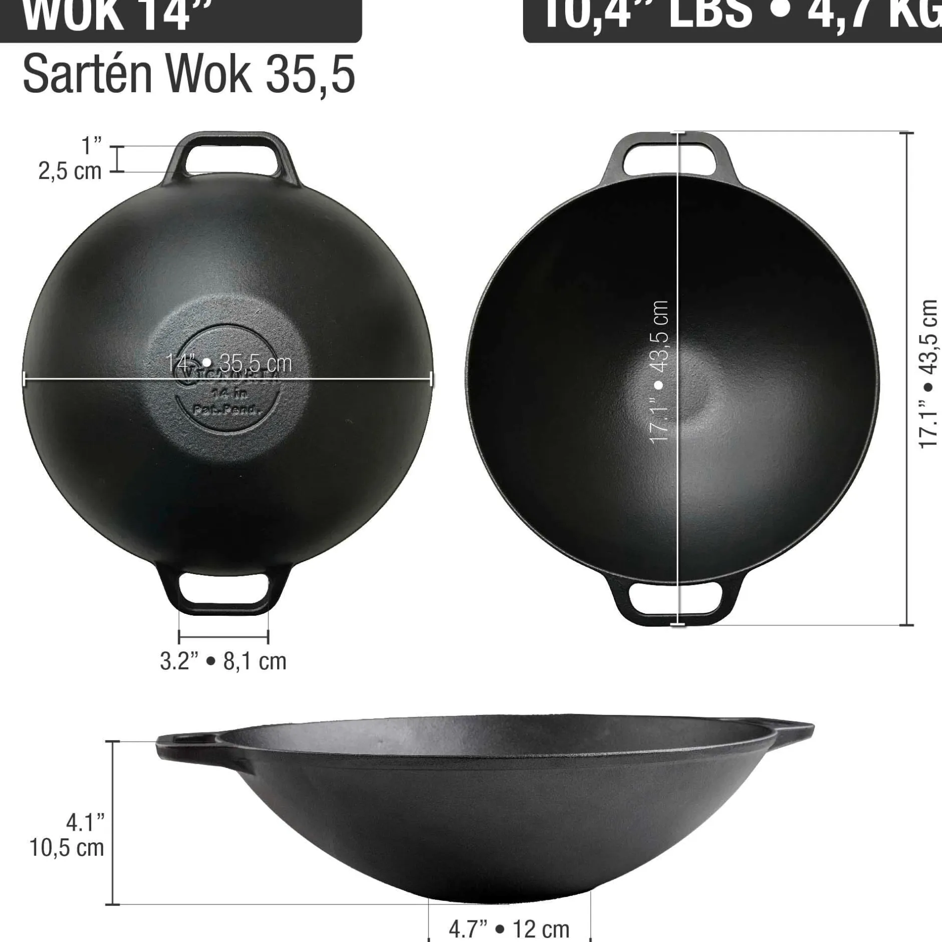 Gusseisen, mit Leinöl eingebrannt. Boden Ø 12 cm, Ø oben 36,4 cm. Randhöhe 10,5 cm. Breite gesamt 43,5 cm. Gewicht 4,5 kg.