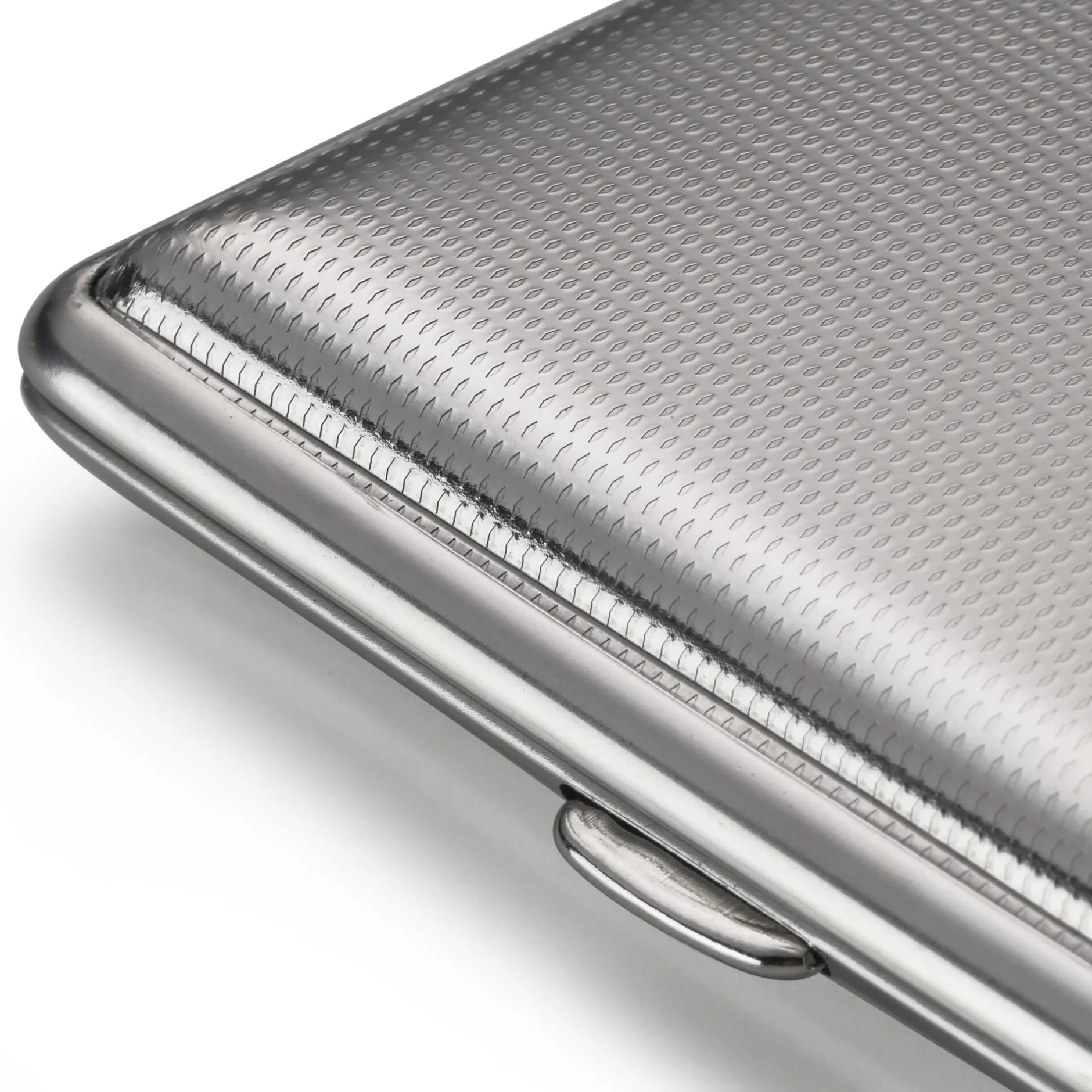 Das Tiefziehen ist ein industrielles Massenproduktionsverfahren – fachlich dem sogenannten Zugdruckumformen zugehörig –, das die kostengünstige Reproduktion von Metallbauteilen und damit die Herstellung hochwertiger, aber nicht hochpreisiger Produkte ermöglicht. In Deutschland ist das Tiefziehen von Konsumgütern dennoch selten geworden, jedoch nicht aus Gründen der Qualität, sondern des verschärften globalen Wettbewerbs. Von einem der wenigen verbliebenen deutschen Hersteller stammen unsere tiefgezogenen Etuis aus hochglänzend vernickeltem Stahlblech, das dank seiner Robustheit – harte Schale, geschützter Kern – hochgeschätzt wird. Boden und Deckel sind mit unterschiedlichen Dekoren geprägt: mit Punktdekor, mit floralem Muster oder mit einem Streifendekor und Gravurfeld.