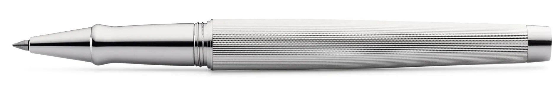 Was sein Schreibverhalten betrifft, ist dieser Tintenroller zwischen einem Füllfederhalter und einem Kugelschreiber anzusiedeln. Korpus 925er Silber massiv mit feiner Korn- bzw. Linienguilloche und glänzend poliertem Gravurfeld (30 x 5 mm). Schraubbare Kappe, Gewinde Kunststoff. Clip Stahl vernickelt, rhodiniert. Länge geschlossen 13,5 cm, schreibfertig 12 cm. Gewicht 40 g. Lieferung mit einer Tintenmine mit Edelstahlspitze und Keramikkugel, Strichstärke 0,7 mm, und Silberputztuch.