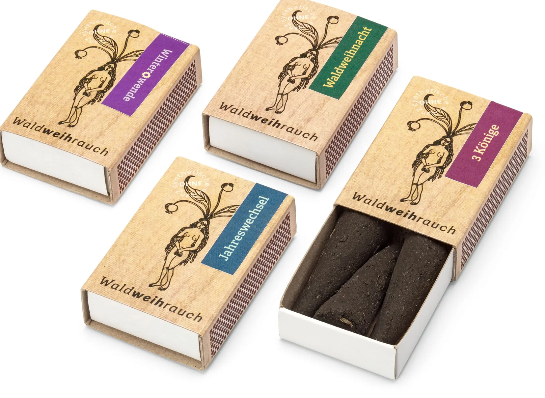 Die Rezepturen der Räucherkegel enthalten ausschließlich Räucherkräuter aus der mitteleuropäischen Tradition, die zu zwei Themensets zusammengestellt sind: „Raunächte“ und „Stimmung“. Zum Abbrennen die Räucherkegel entweder in ein Räucherhäuschen oder einfach auf einen Teller mit Sand stellen, anzünden und, sobald der Kegel glimmt, wieder auspusten. Durch das schonende Verglimmen verbrennt das Räuchergut nicht, sondern setzt langsam seinen Duft frei. Die Waldweihrauch-Räucherkegel sind etwas „gröber“. Das ist Absicht, denn mit jedem Zerkleinerungsvorgang geht Aroma verloren. Deshalb werden möglichst große Stückchen der Aromazutaten in die Mischungen gegeben. Der Duft kann sich während des Verglimmens leicht verändern, je nachdem, welche Inhaltsstoffe die Glut gerade erreicht. Für ein intensiveres Erlebnis können Sie den Duftrauch auch mit der flachen Hand zur Nase wedeln.