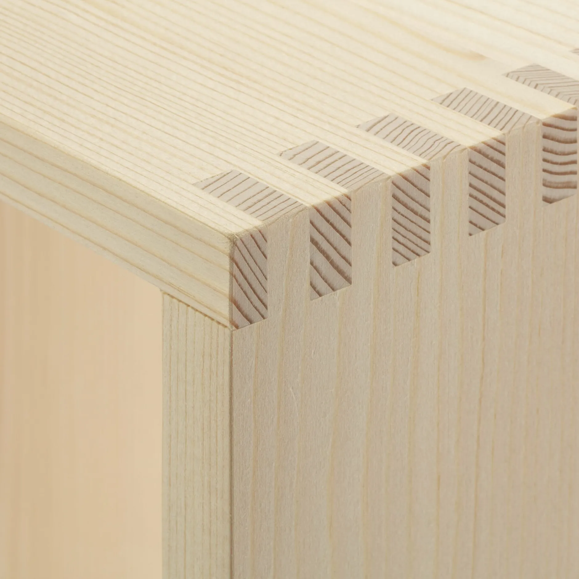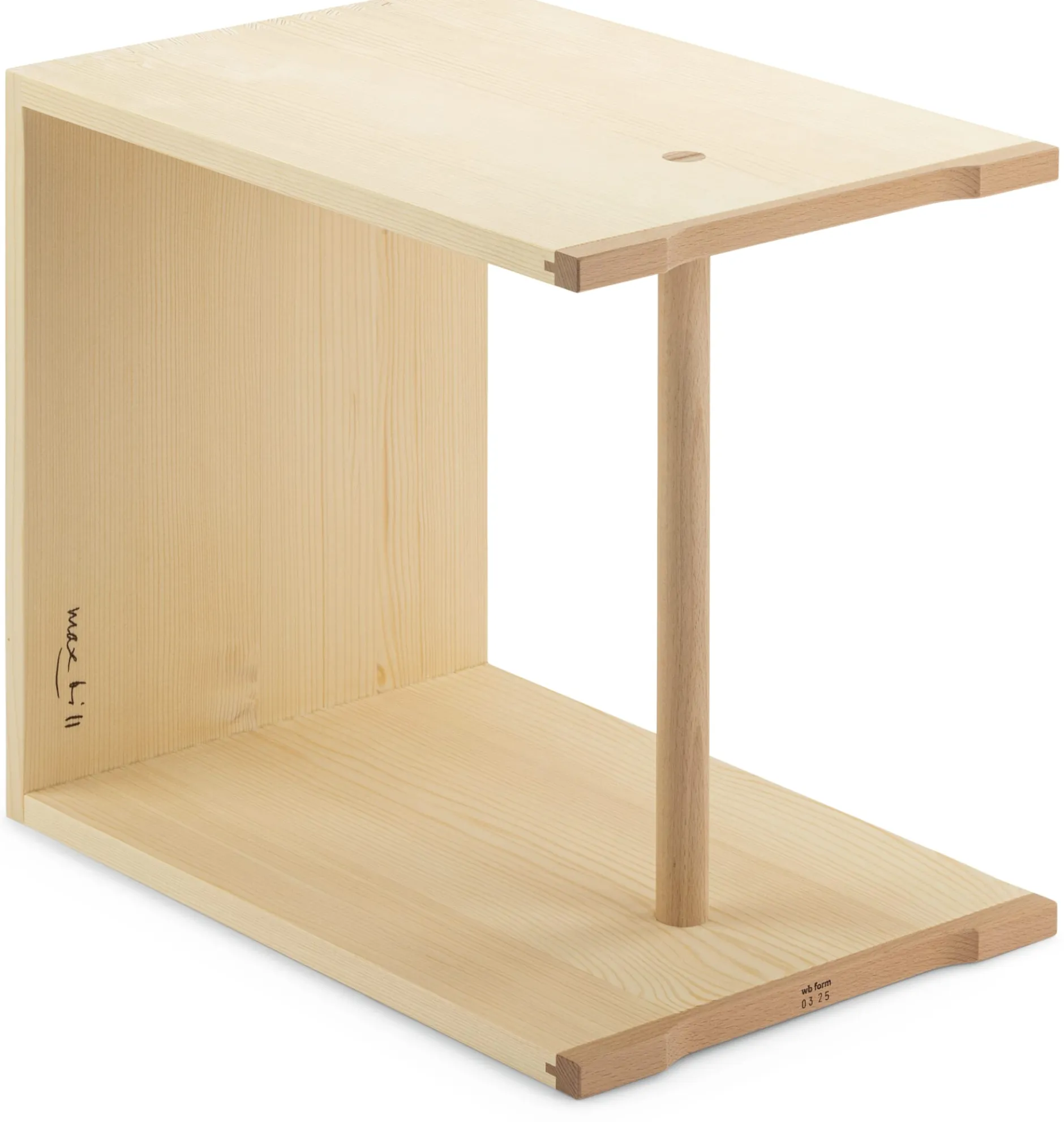 Fichtenholz natur, Querstab und Standflächenleiste Buchenholz (alle Hölzer Herkunft Schweiz). Höhe 44 cm, Breite 39,5 cm, Tiefe 29,5 cm. Gewicht 2,1 kg.