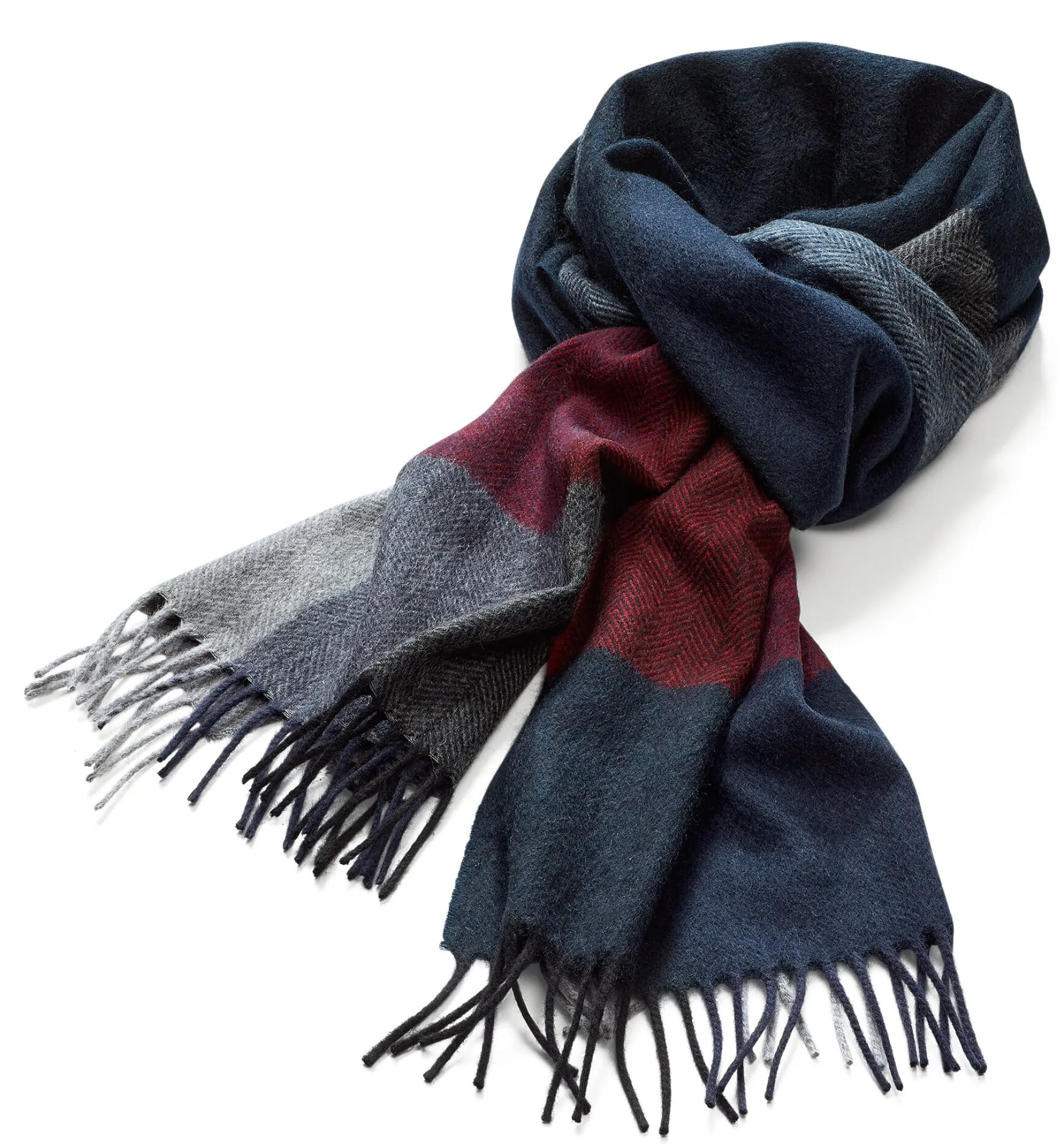 Wunderbar weicher Schal, der je zur Hälfte aus Kaschmir und Lammwolle besteht. Das feine Gewebe ist als Fischgrat ausgeführt und in unterschiedlich farbige Blöcke unterteilt. Fransenkanten bilden den Abschluss an den Enden des Schals.