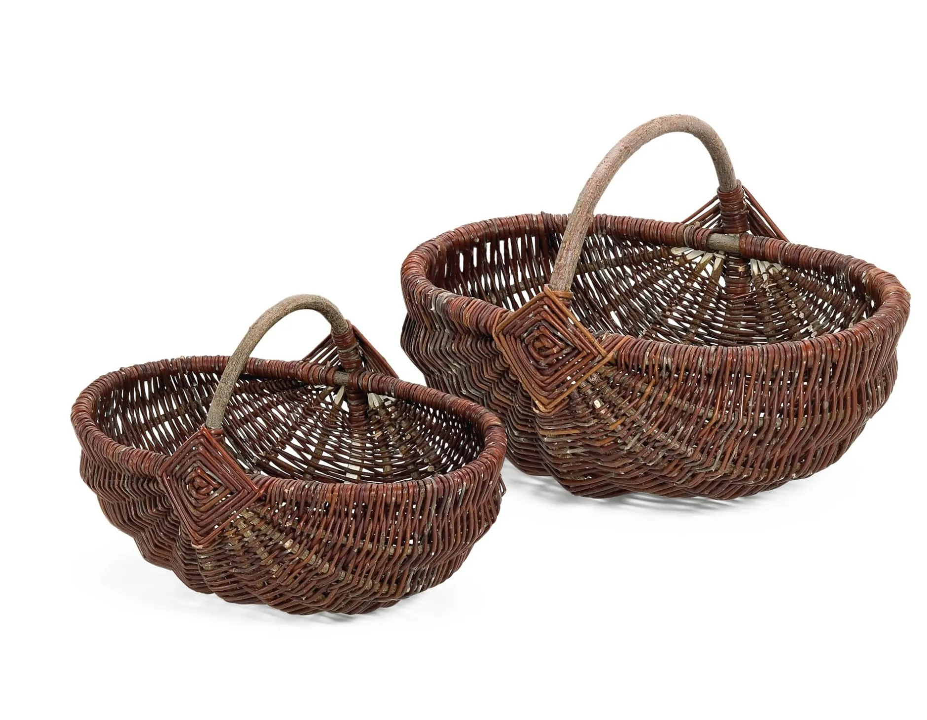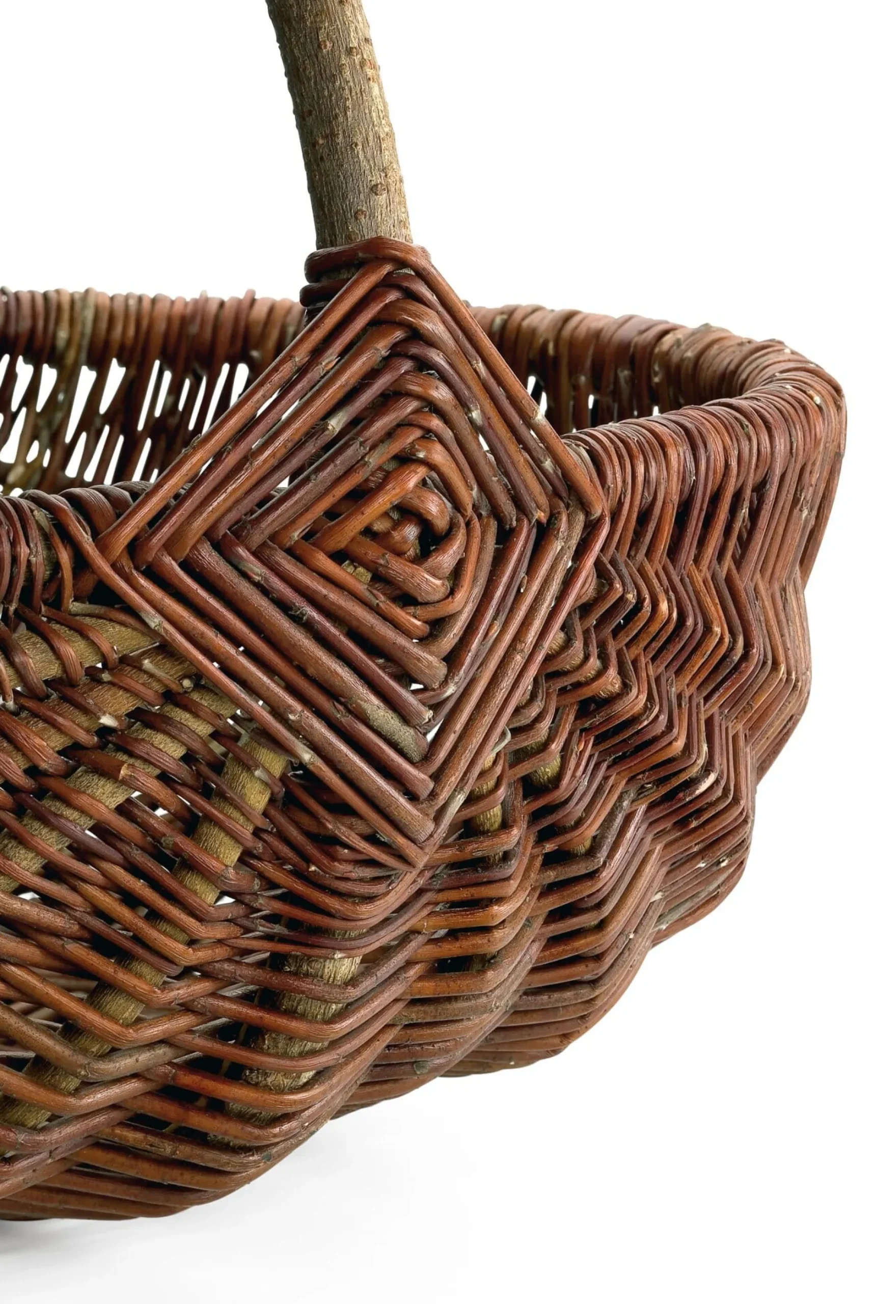 Vielseitig verwendbare Henkelkörbe für verschiedenste Einsatzzwecke: als Einkaufskorb, zum Ernten und Transportieren im Garten, zum Pilzesammeln und vielem mehr. Eine Besonderheit dieser in Handarbeit gefertigten Körbe ist das „Gottesauge“: eine aufwendige Flechttechnik, die den Henkel auf sehr schöne und haltbare Art mit dem Korpus verbindet.