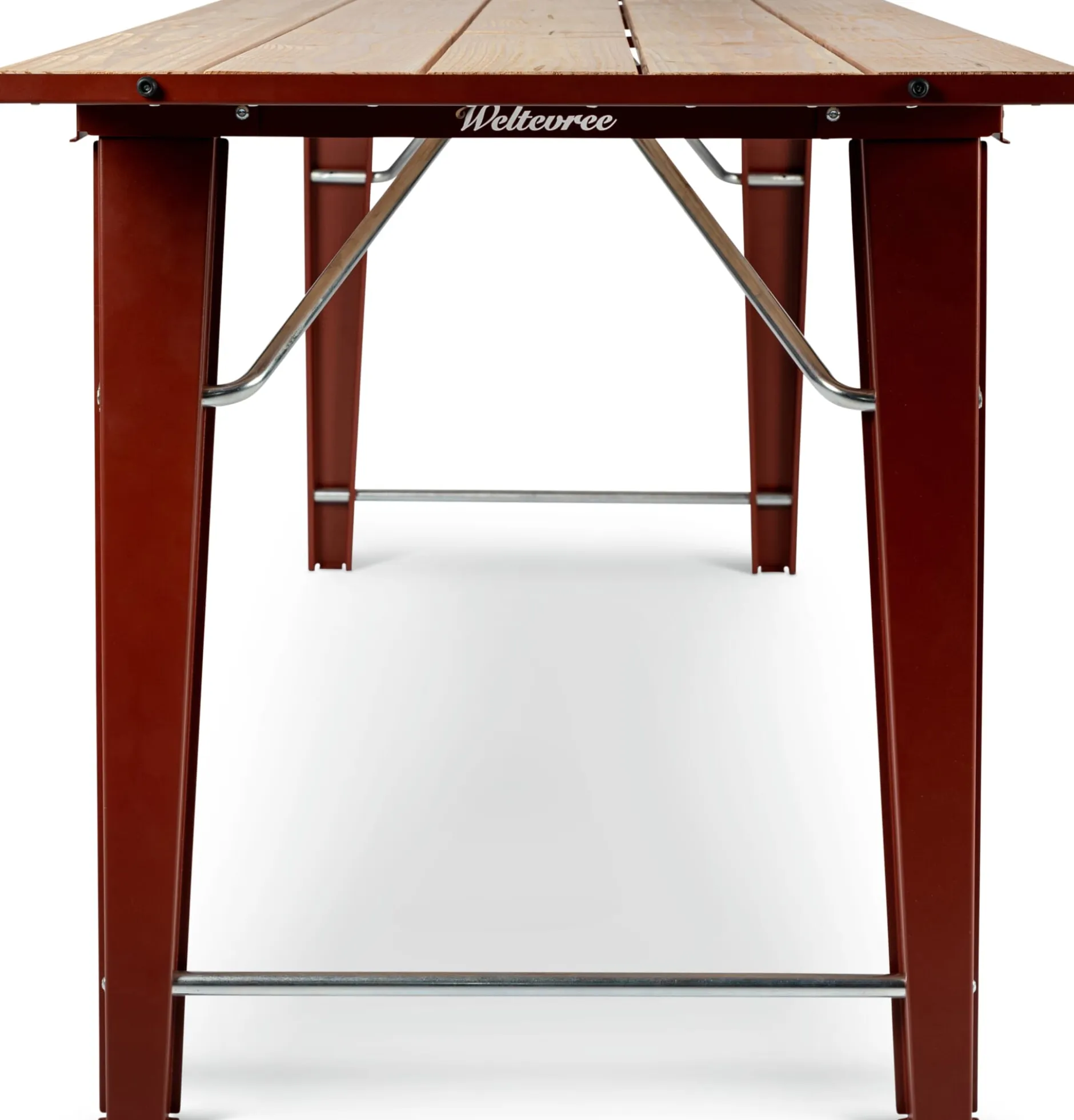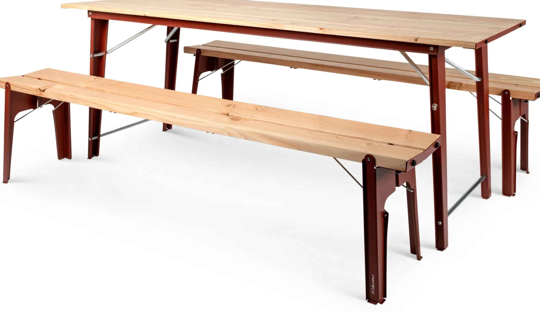 Endlich eine zeitgenössische Interpretation und Optimierung der klassischen Bierzeltgarnitur! Biertisch und Bierbank, nur besser, sozusagen. Die Gestaltung ist neu – die Tugenden des bewährten Möbeltyps bleiben: SALUT ist stabil gebaut, mit robusten Gelenken zum Zusammenklappen ausgestattet und gut lager- und transportfähig.