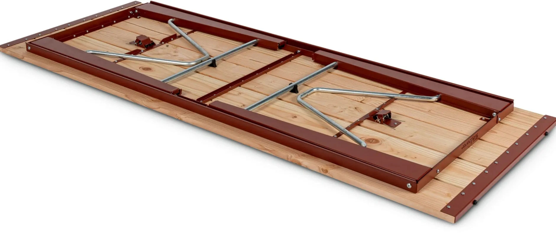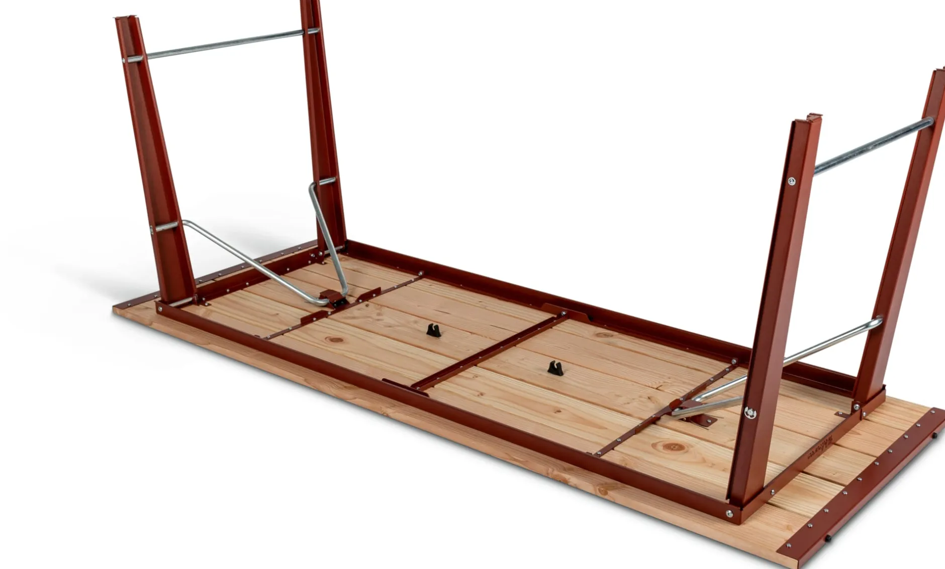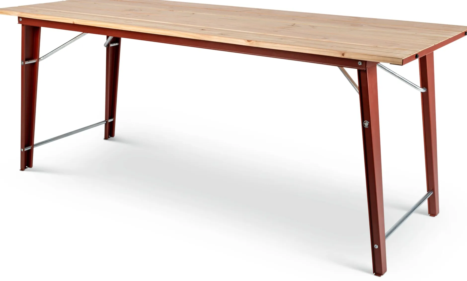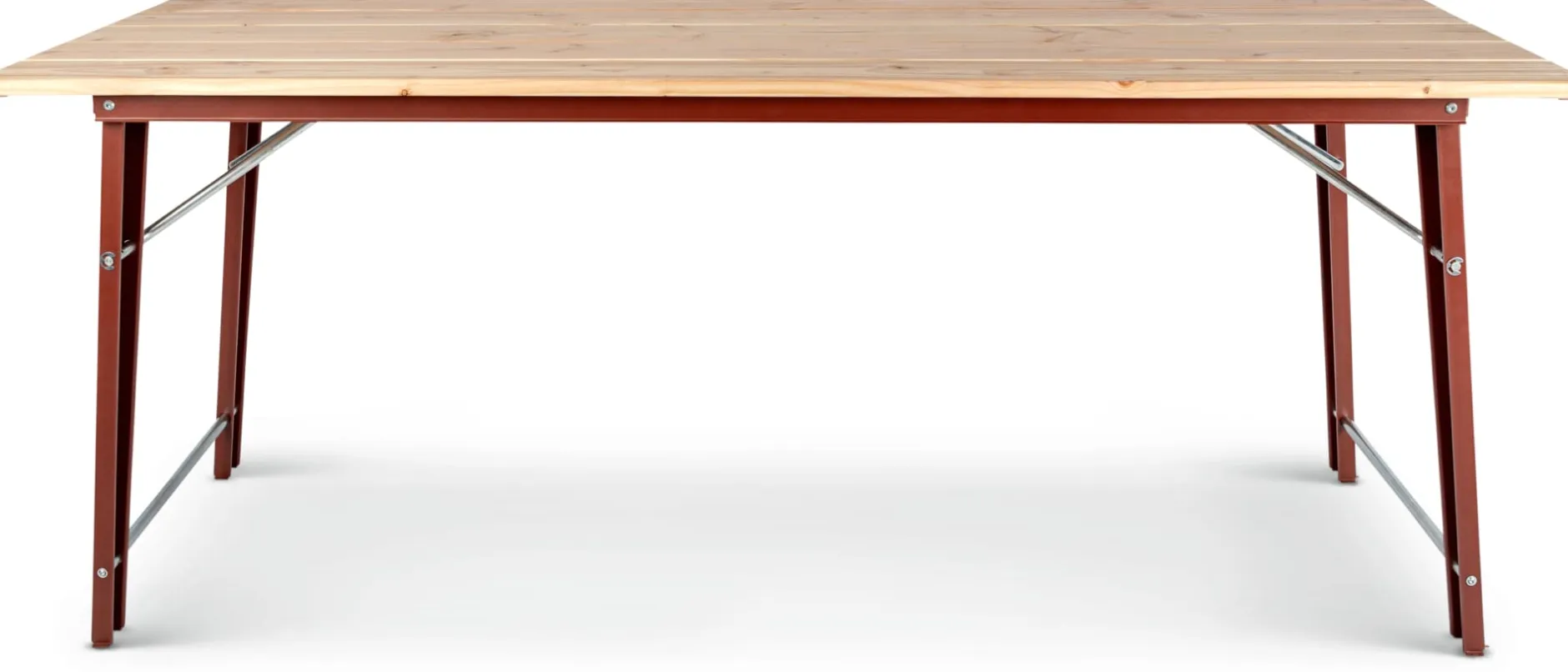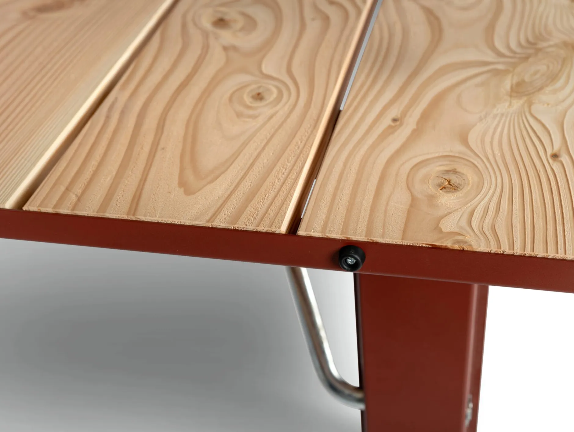 Material: Stahl, pulverbeschichtet (RAL 3009 Oxidrot); Lärche (Herkunft: Polen)