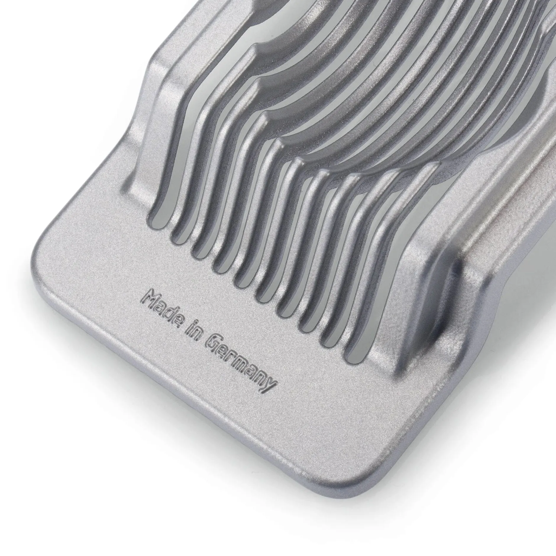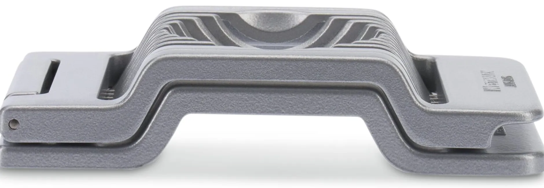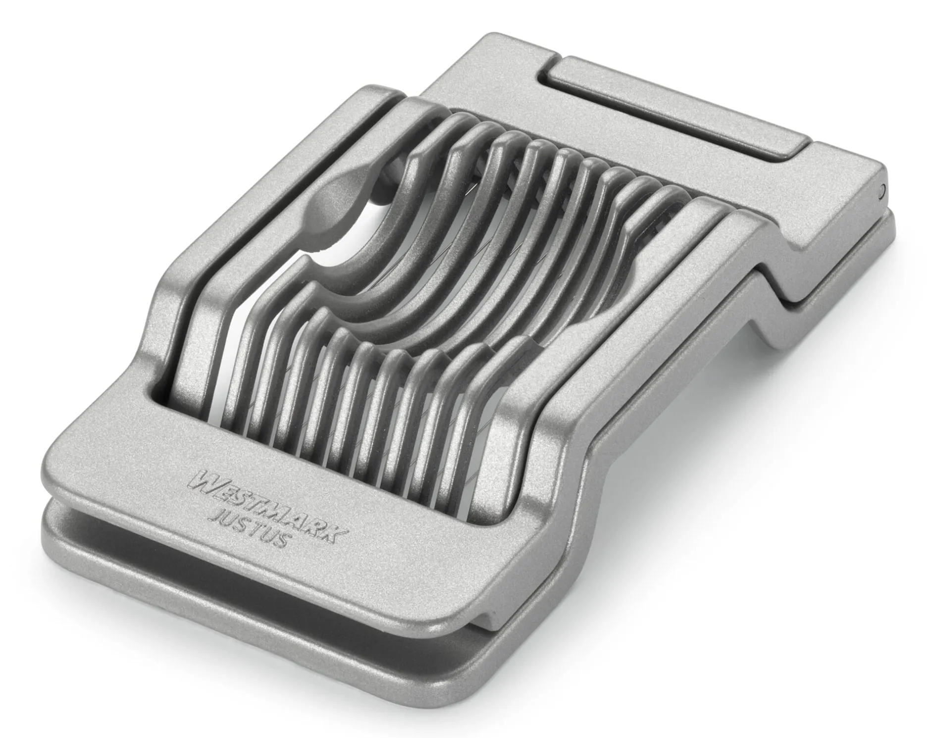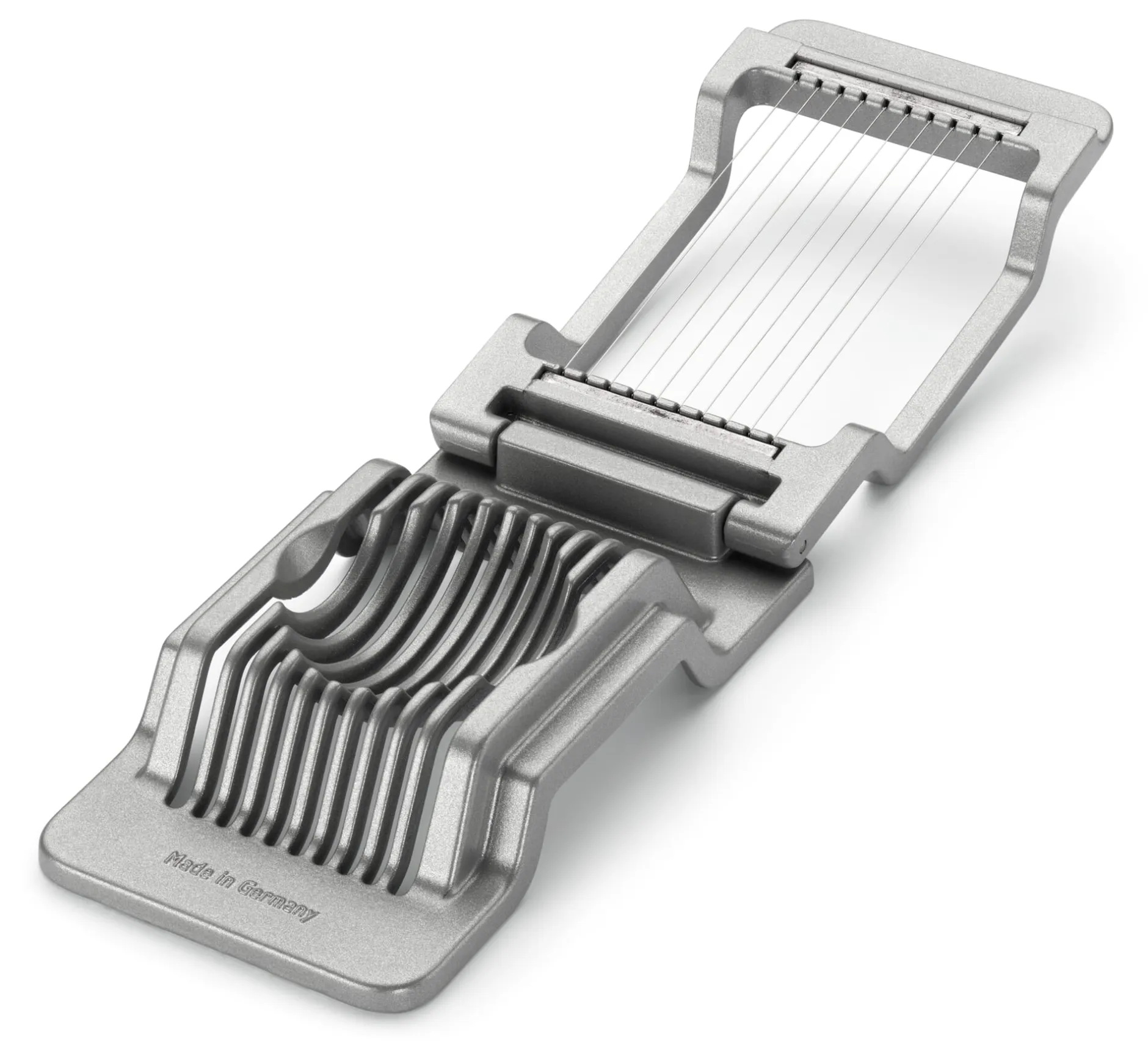 Aluminumdruckguss beschichtet. 10 Schneidedrähte aus Edelstahl (rostfrei, Länge 8,8 cm, Ø 0,2 mm). Breite 8 cm, Höhe 3 cm. Gesamtlänge 14 cm. Gewicht 200 g. Für die Spülmaschine geeignet.