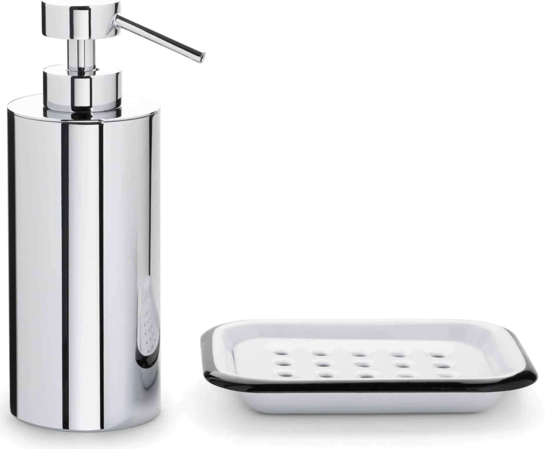 Seifenspender und Pumpe aus verchromtem Messing. Seifentank aus Pressglas, klar. Saugschlauch aus Kunststoff. Volumen 140 ml. Höhe 16 cm, Ø 6 cm. Gewicht 590 g. Lieferung ohne Seife.