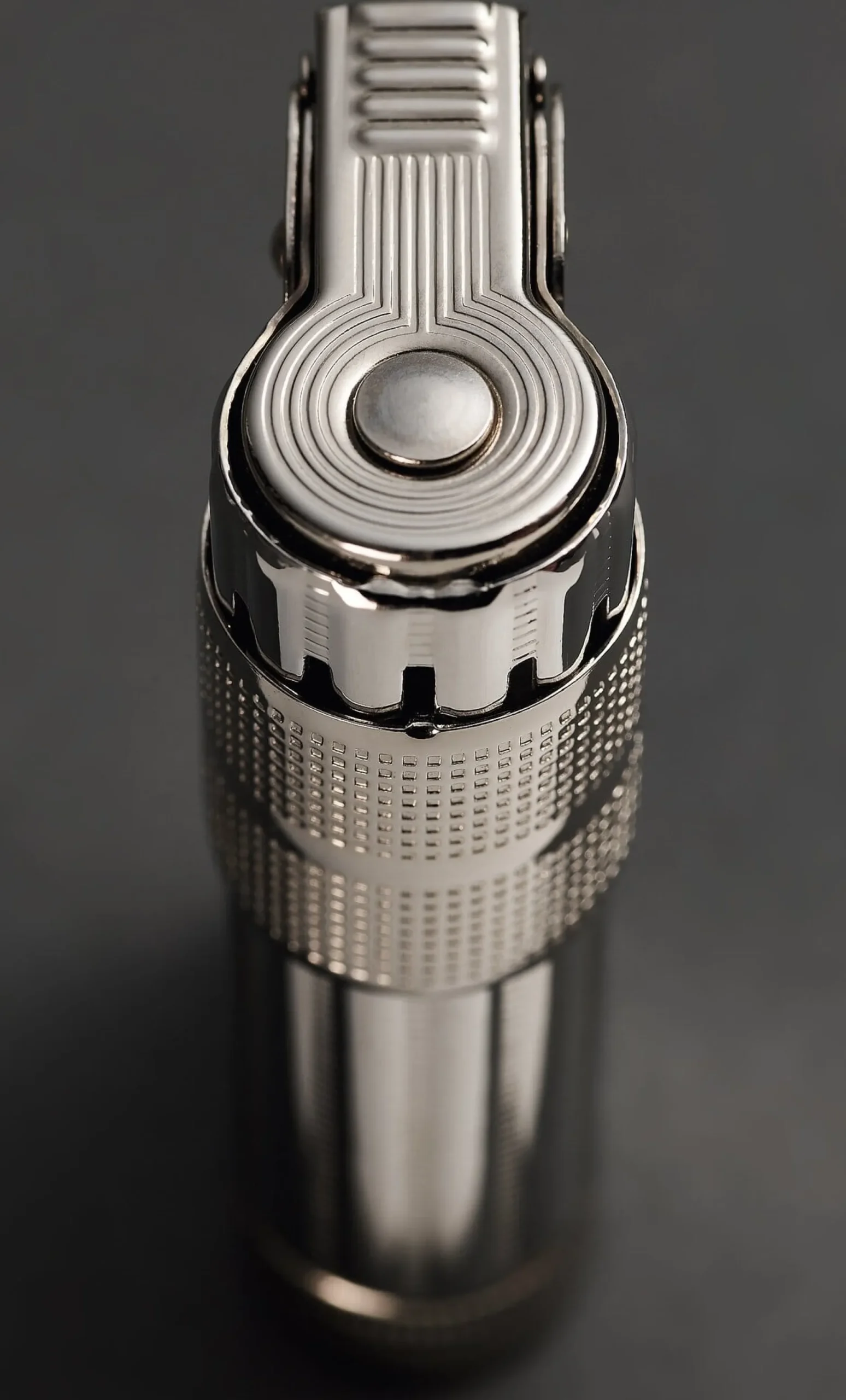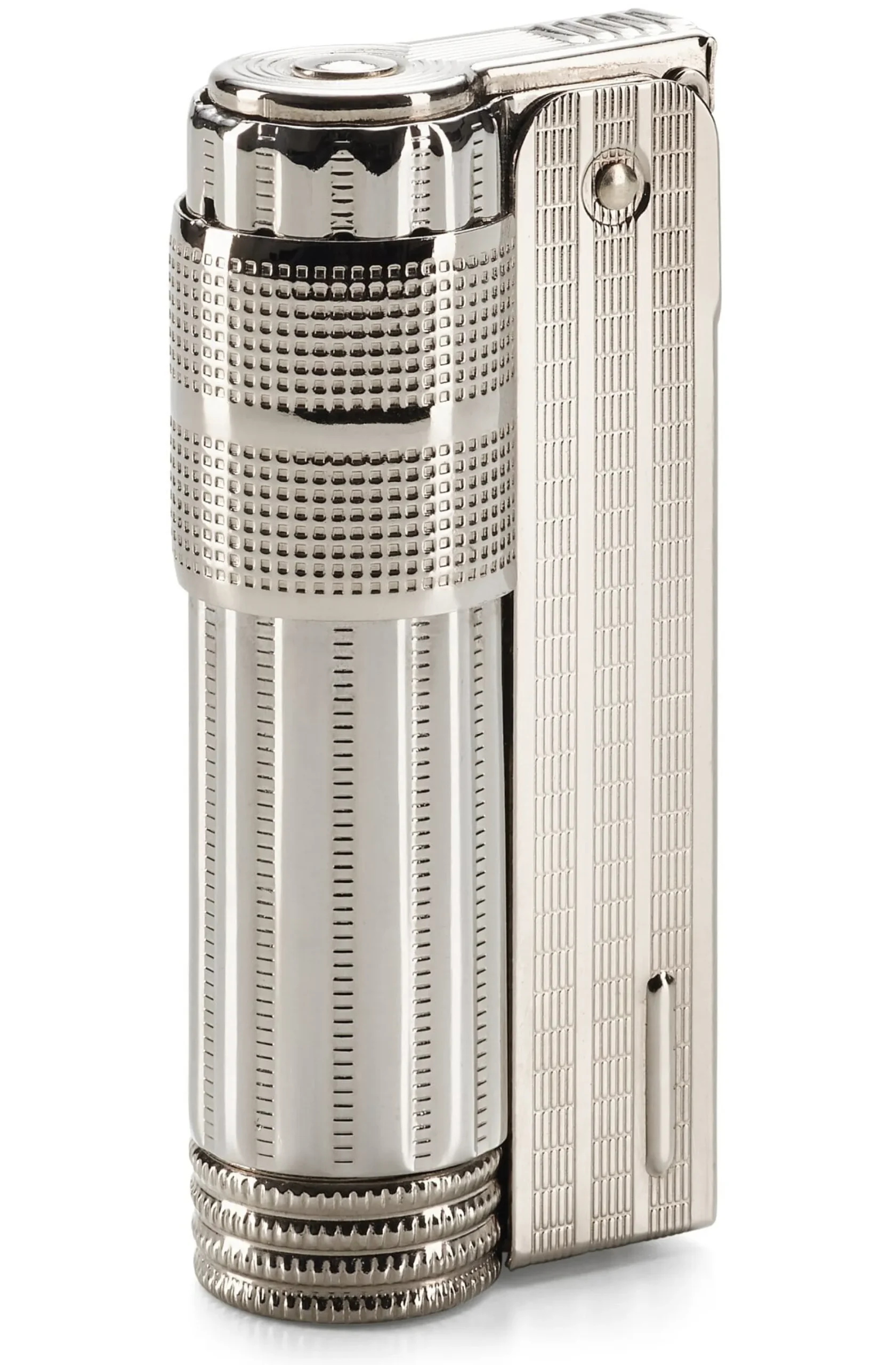 Stahl, vernickelt. Länge 2,9 cm, Breite 1,8 cm, Höhe 6,2 cm. Gewicht 38 g. Lieferung in einer Geschenkbox.