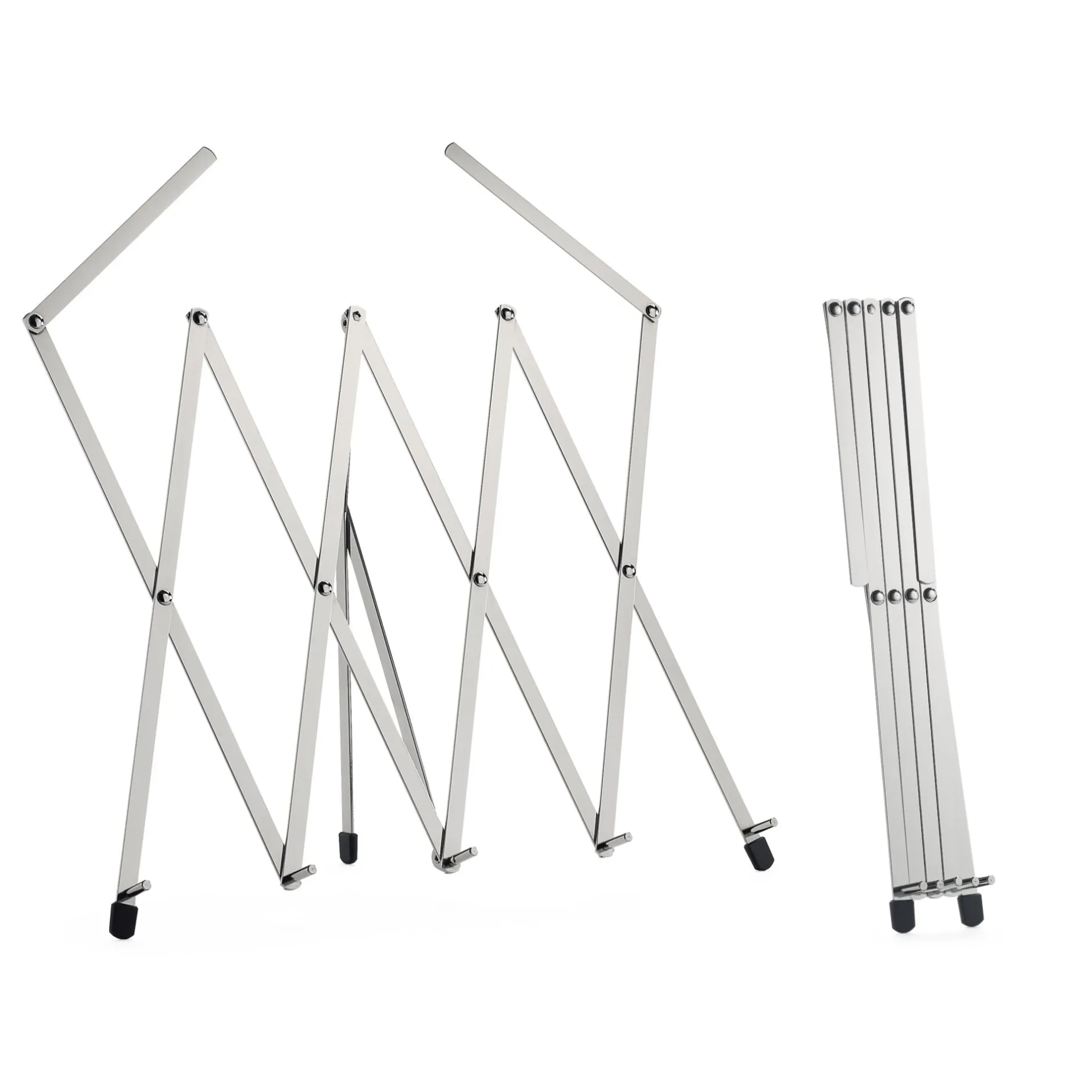 Stahl vernickelt. Kunststoffüße. Höhe 26 cm, Breite 4–90,5 cm, Tiefe 4 cm. Gewicht 250 g. Lieferung ohne Demonstrationsobjekte.