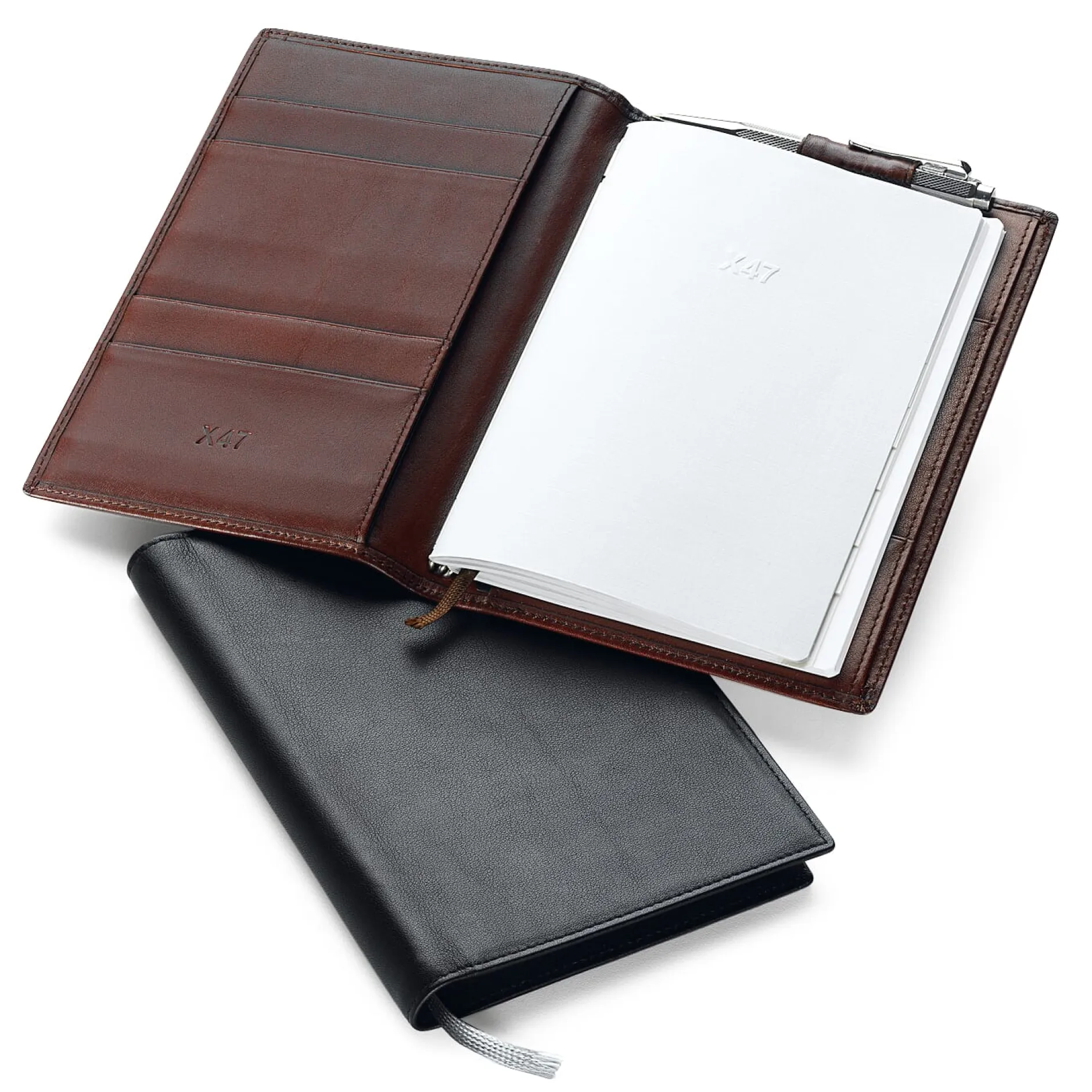 Dieses X47-Organisationssystem fasst lediglich drei A6-Einlagen und bleibt somit nicht nur wegen des kleinen Formats jackentaschentauglich, sondern auch im Umfang schlank. Ansonsten ist es wie die größeren Varianten aus feinem Rindleder gearbeitet. In zwei Steckfächern lassen sich Notizzettel unterbringen, fünf kleinere Fächer nehmen Kreditkarten auf. Zwei verschiedenfarbige Zeichenbänder dienen als Lesezeichen und eine Schlaufe nimmt einen schlanken Stift bis 10 cm Länge auf.
