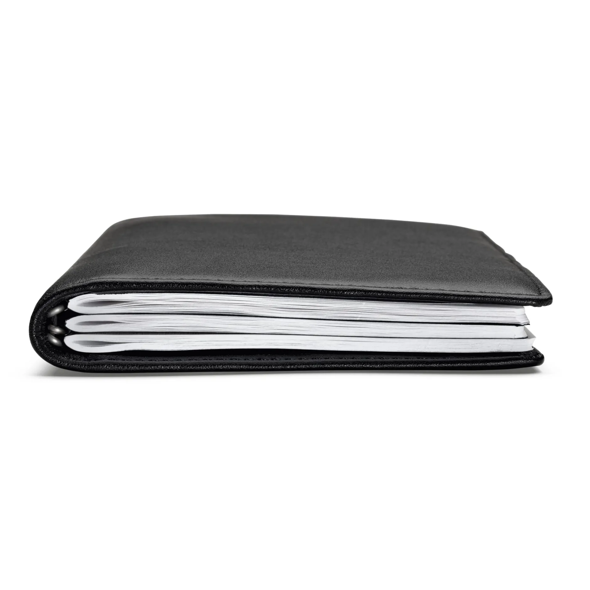 Für 3 Einlagen des Formats A6. Aus feintäschnerisch verarbeitetem Rindleder. Mit 2 Einsteckfächern, 5 Kreditkartenfächern, 2 Zeichenbändern und einer Stiftschlaufe für schlanke Schreibgeräte bis 10 cm Länge.