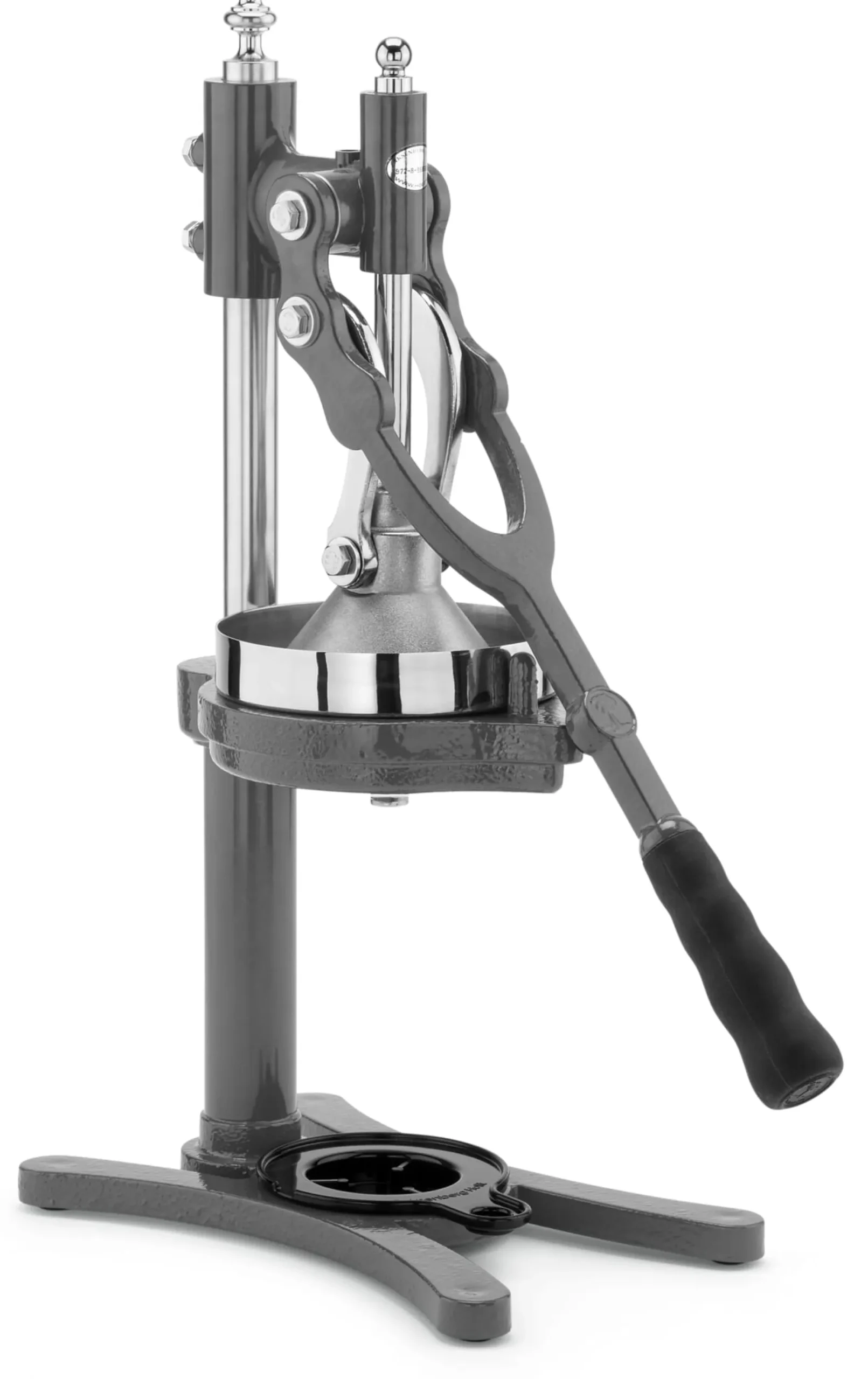 Beachten Sie bitte, dass bei der eher industriellen Verarbeitung und Aufmachung dieser Zitruspresse kleine Fehler in der Lackierung vorkommen können. Der Presskegel aus Edelstahl kann hier und da leicht scharfkantig sein.