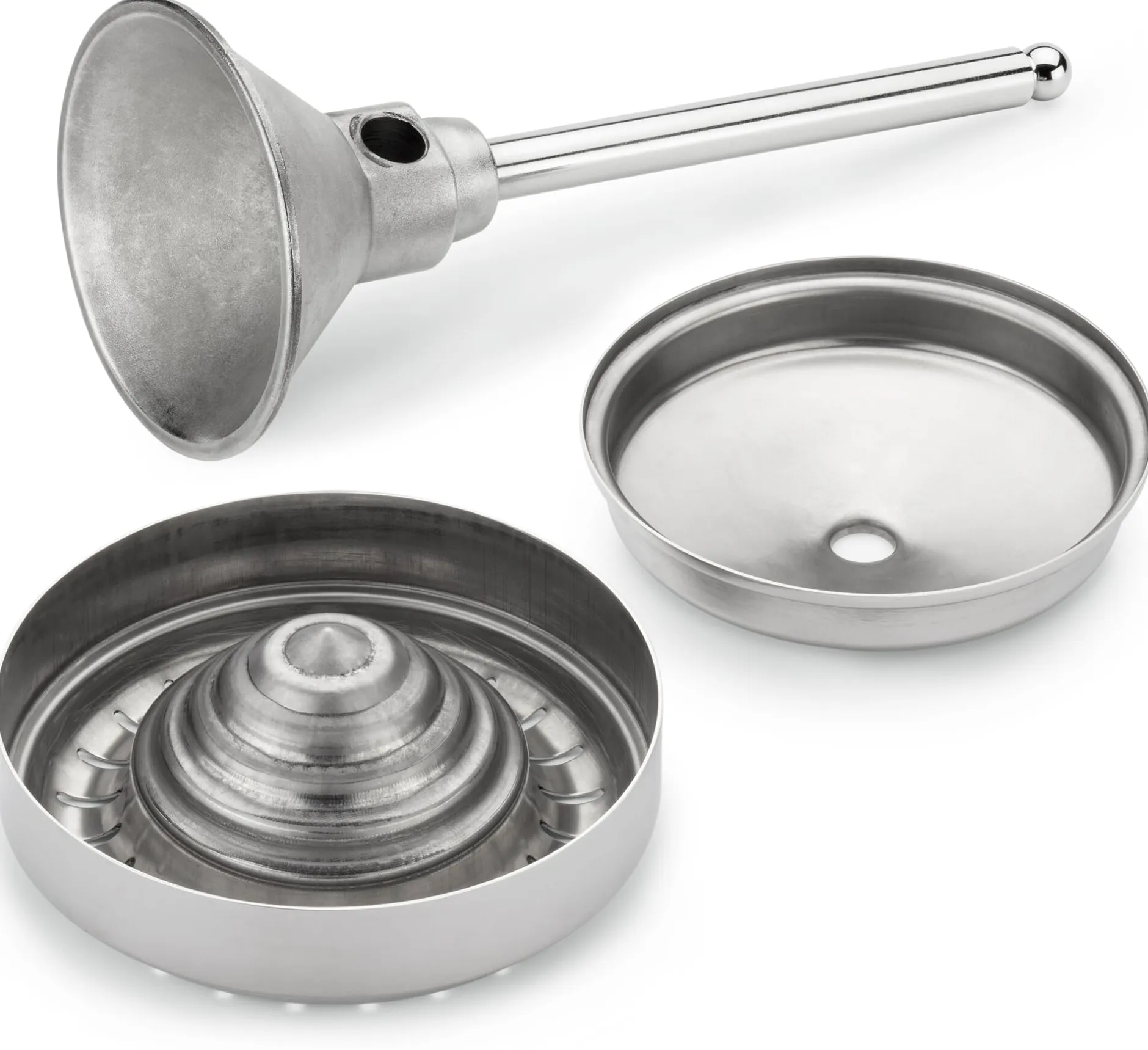Presskegel, Filter und Trichter aus Chrom-Nickel-Molibdän-Stahl. Saftauffangschale aus Polyamid. Höhe 4 cm, Ø 14,5 cm. Gewicht 300 g.