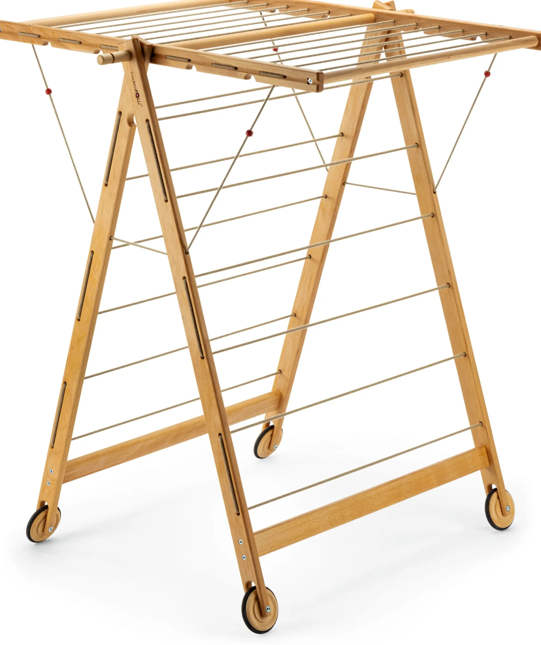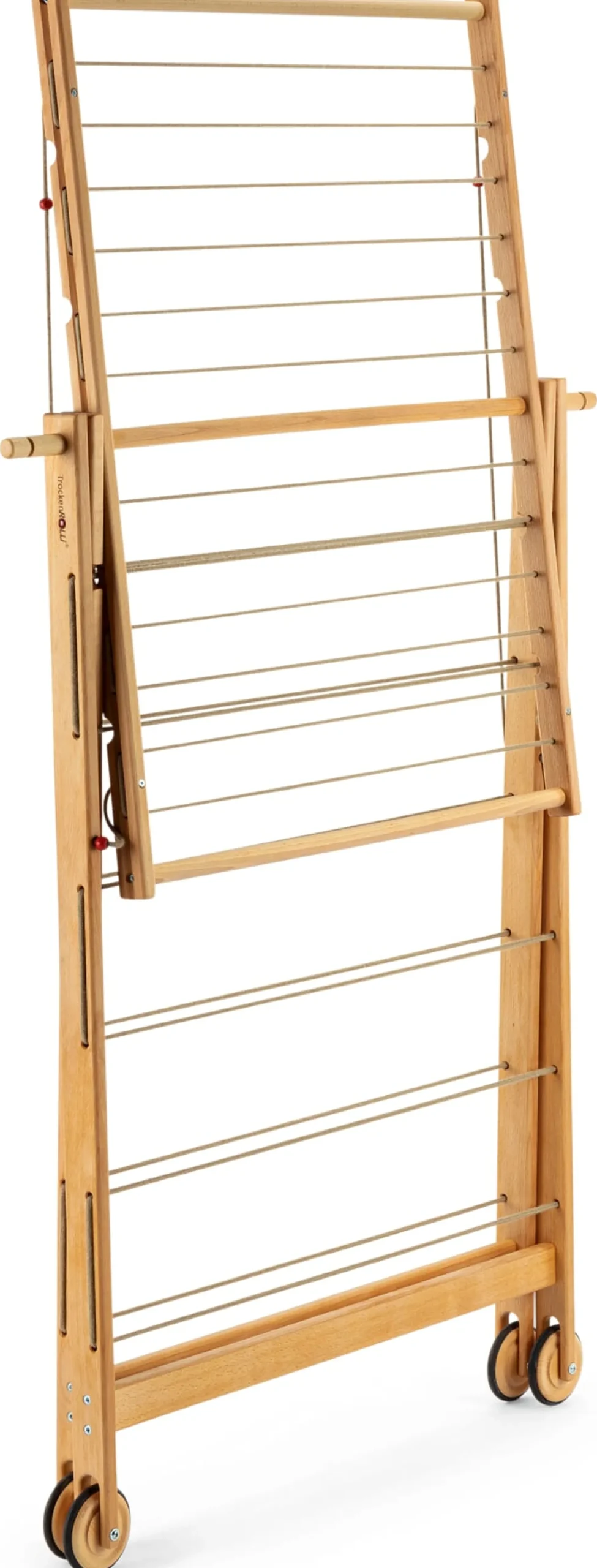 Gestell aus geöltem Buchenholz (Herkunft Deutschland). Gummibereifte Buchenholzräder. Schnüre aus Polypropylen. H 118 × B 95 × T 94 cm, Klappmaße H 164,5 × B 95 × T 20 cm. Leinenlänge 16,5 m. Gewicht 7,5 kg. Inkl. Montageanleitung.