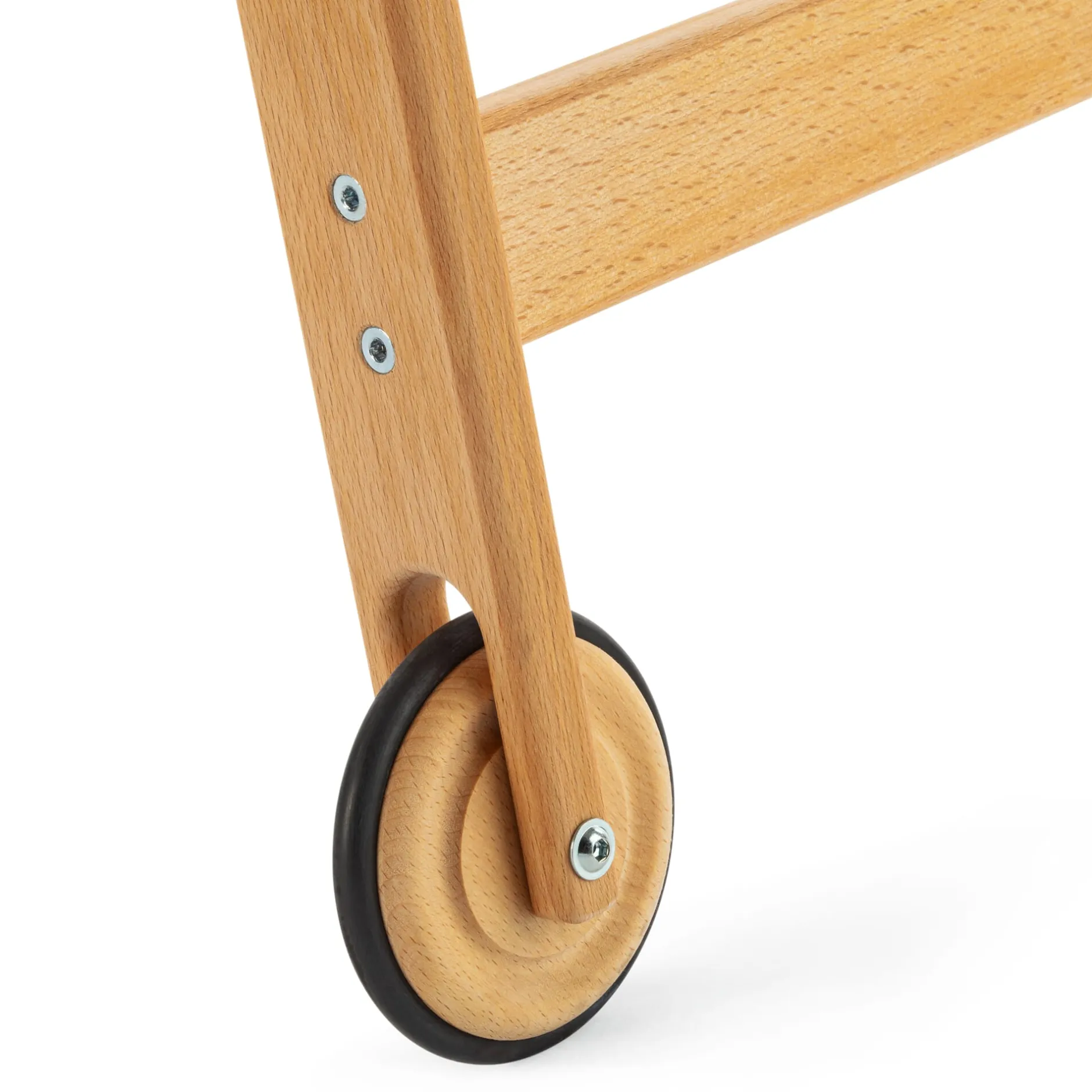 Aus massivem Buchenholz gefertigt, zeigt dieser Wäscheständer bei aller Solidität des Materials ein filigranes Design, das ihn in jeder Umgebung so dezent wie stilvoll auftreten lässt. Seinen Namen aber verdankt der Trockenrolli nicht seiner Gestaltung, sondern seinen vier gummibereiften Buchenholzrädern, die auch unter voller Beladung leichtgängig einherrollen. Ungewöhnlich, doch clever: Die Rollen sind nicht quer, sondern längs zum Gestell montiert. So lässt er sich leicht(er) aus seinem Nischendasein holen und sogar einhändig zielsicher manövrieren (besonders hilfreich, wenn Sie unter dem anderen Arm gerade Ihren Wäschekorb balancieren). Derart mobil, müssen Sie nur noch entscheiden, ob Sie Ihre Wäsche heute drinnen oder draußen trocknen: Den Aufenthalt auf Balkon oder Terrasse nimmt das Leinöl-behandelte Buchenholz mit materialtypischem Stoizismus hin – selbst wenn einige Regentropfen fallen. (Bei einem starken Schauer oder anhaltendem Regen sollten Sie den Ständer jedoch nicht nur Ihrer Wäsche zuliebe wieder ins Trockene rollen.)