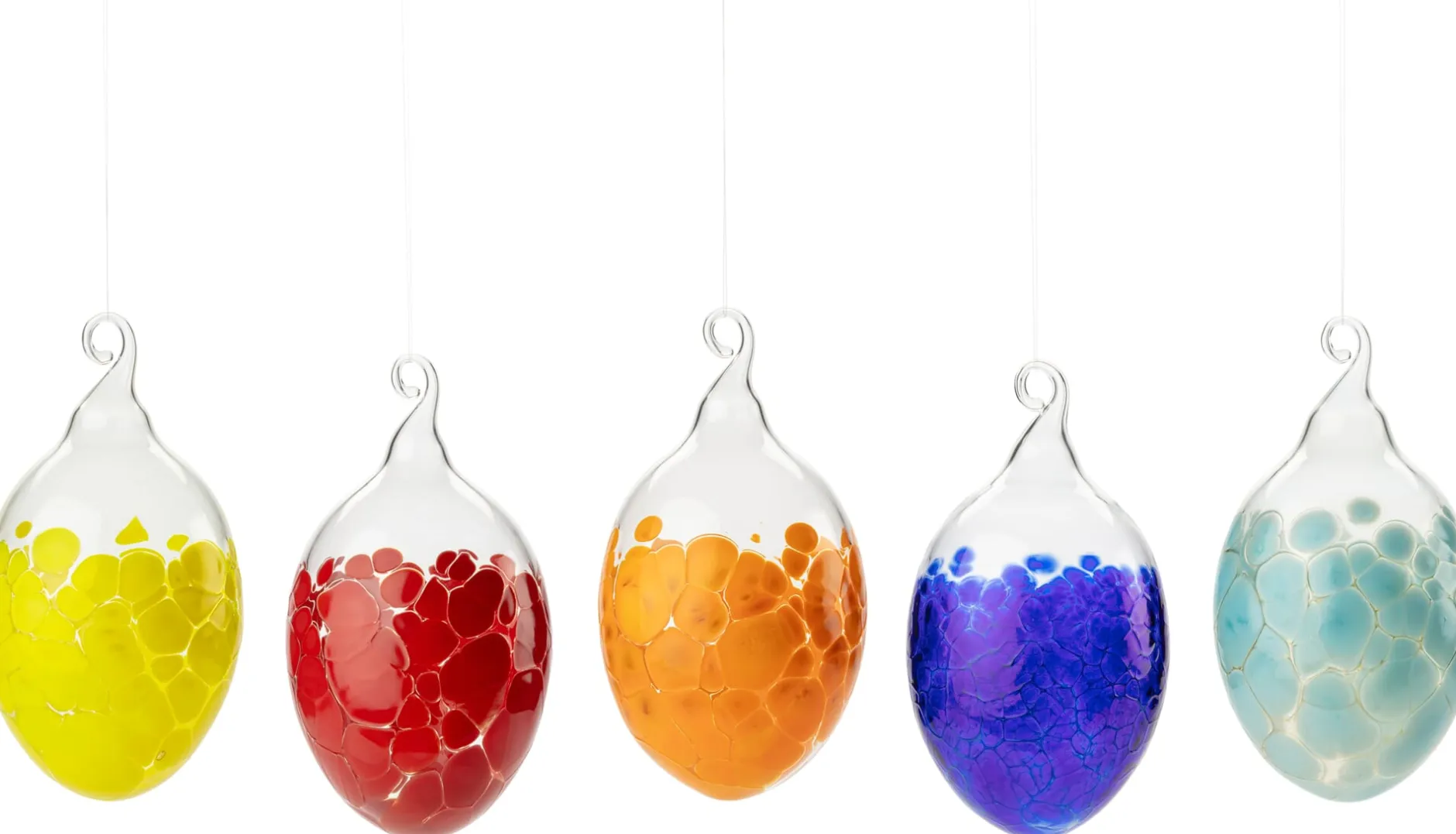 Glas mundgeblasen. Set mit 5 farbigen Ostereiern (à 4,5 × 8,5 cm). Jeweils ein Ei in der Farbe Dunkelblau, Hellblau, Rot, Orange bzw. Gelb. Gesamtgewicht 110 g.