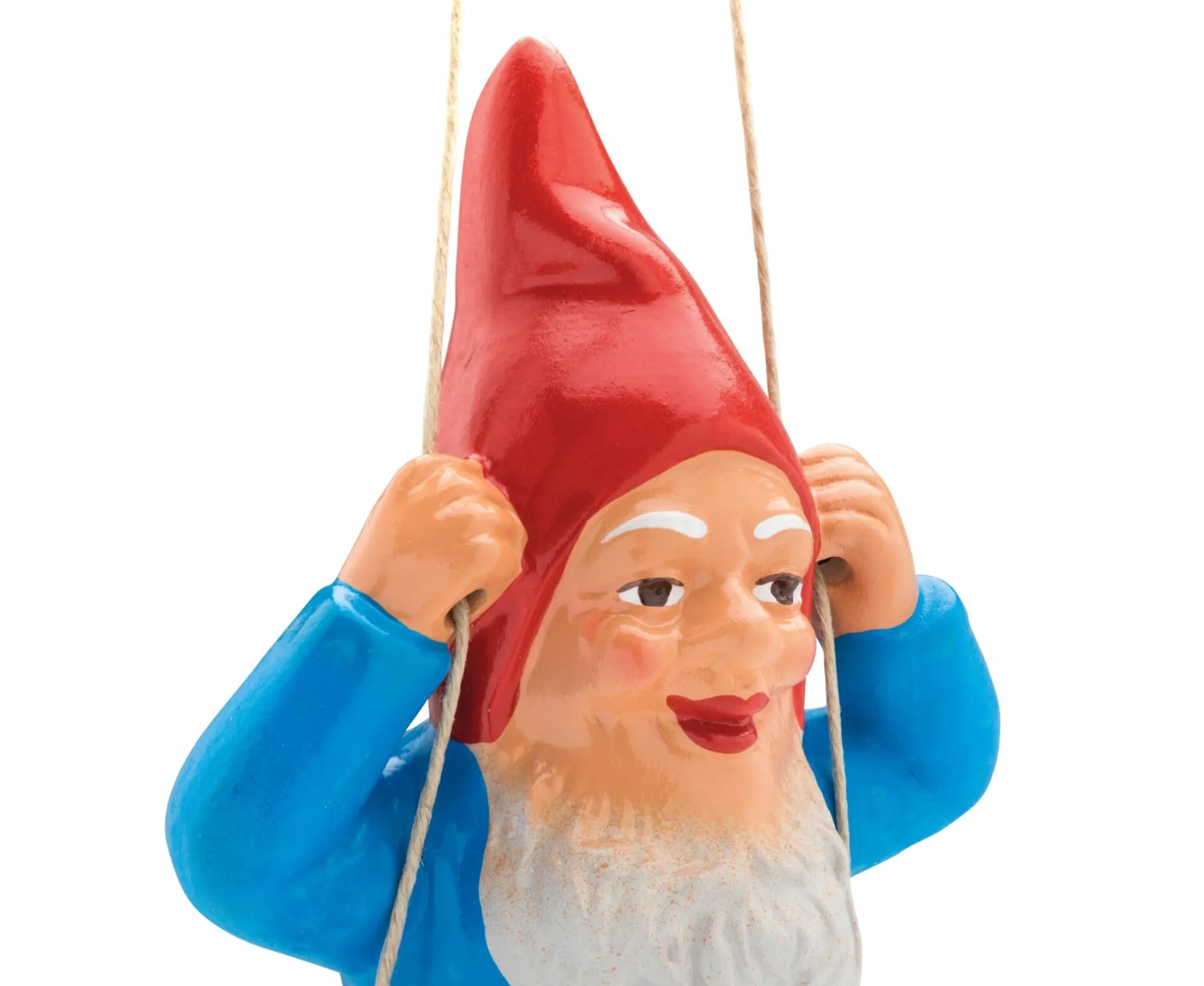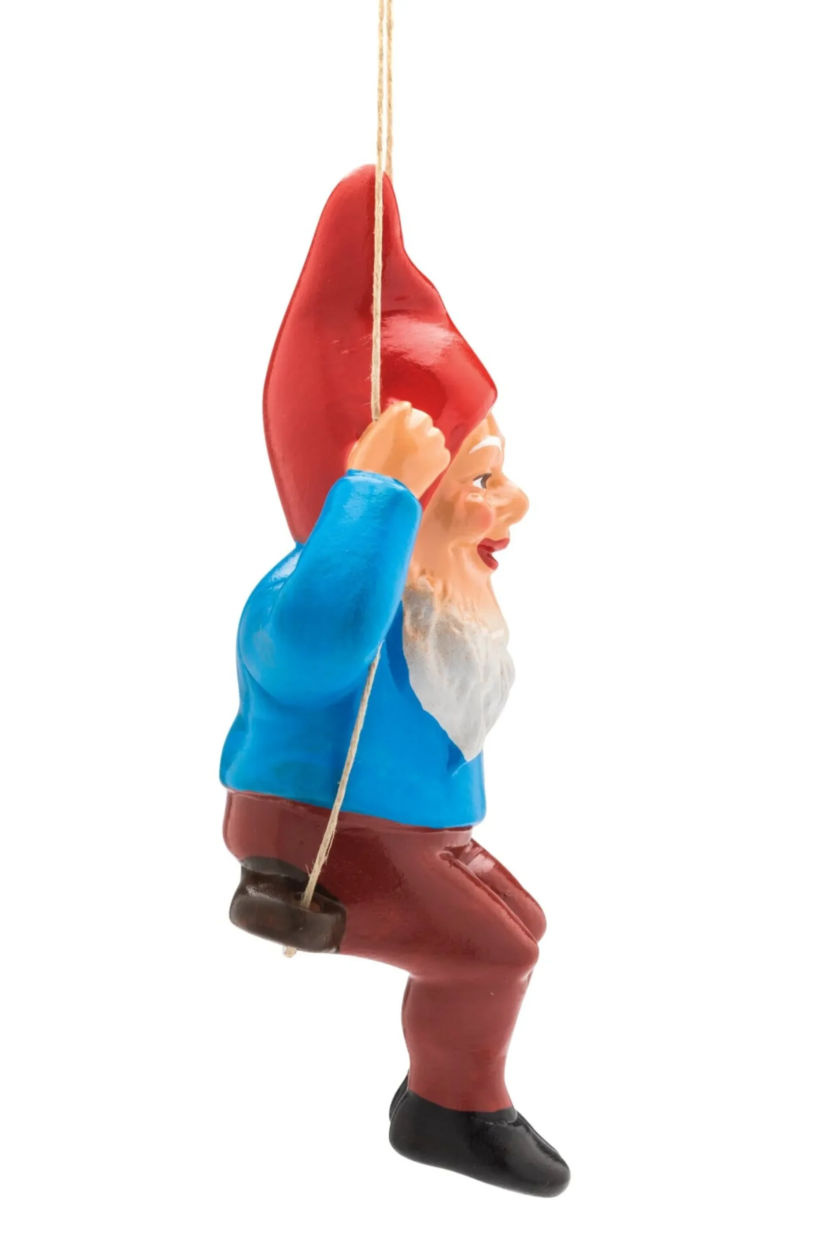 Dieser kleine, handbemalte Gartenzwerg, der fest auf seiner Schaukel hockt, lässt sich tatsächlich ins Schwingen versetzen – wenn man ihn an der stabilen Kordel in Baum oder Strauch oder vielleicht an einen Haken in der Laubenwand hängt. Den Dekorationsmöglichkeiten sind daher kaum Grenzen gesetzt.