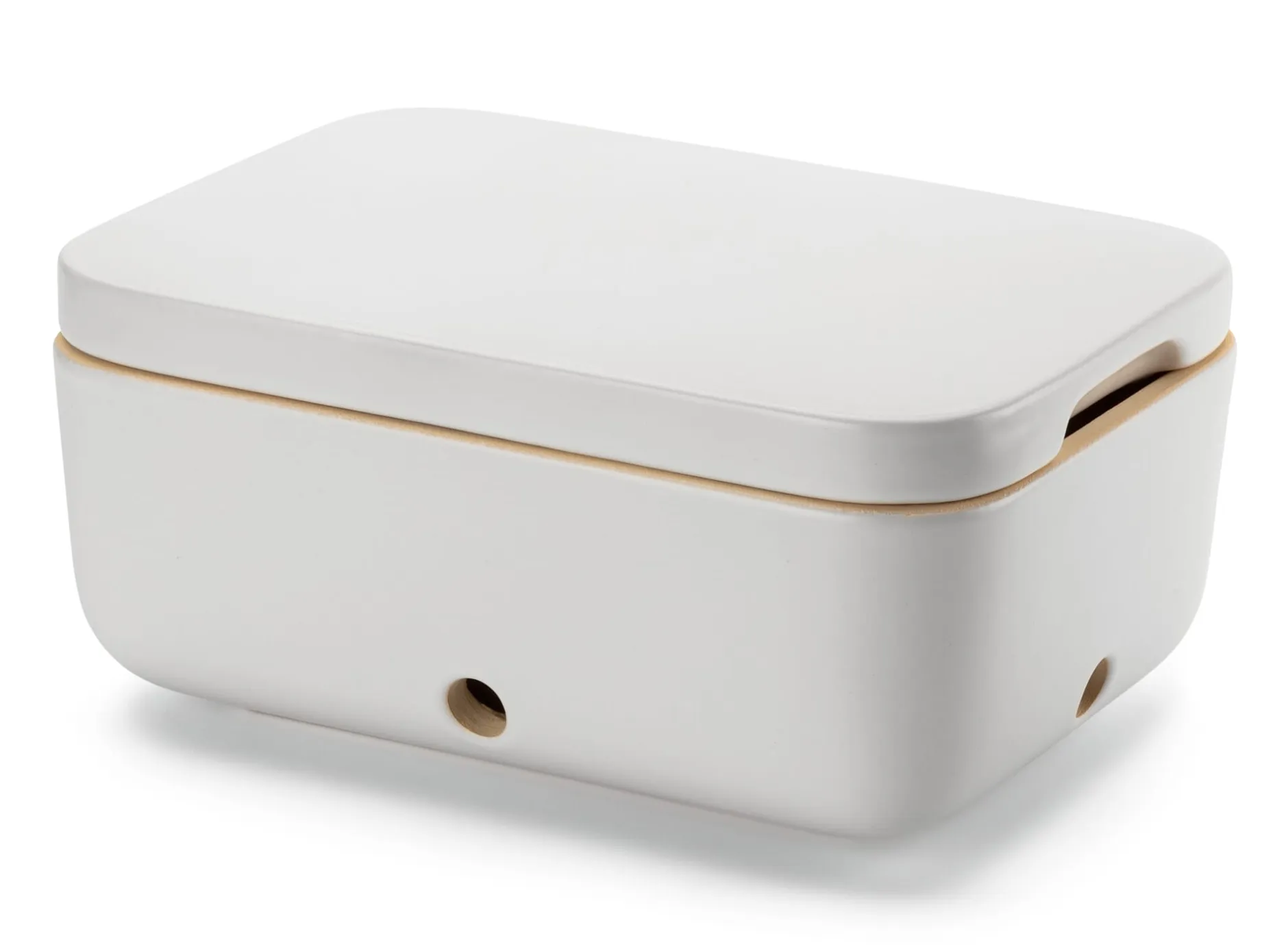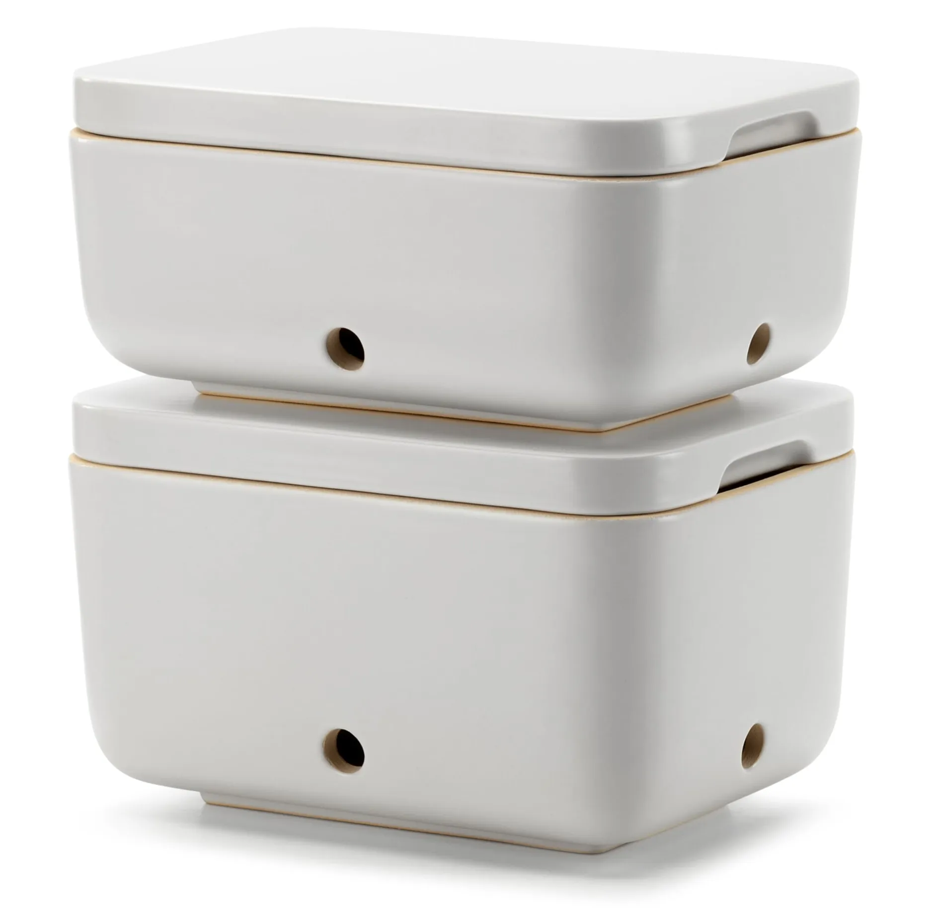 Kleiner formschöner Vorratskasten aus Keramik, einem idealen Material für ein Vorratsgefäß, wenn es so gearbeitet ist wie dieses: Die unglasierten rauen Innenflächen des Behälters speichern bis zu 10 Prozent der Luftfeuchtigkeit. Das sorgt im Zusammenspiel mit der Luftzufuhr durch Löcher an vier Seiten für ein verbessertes Klima für das Lagergut. Ideal geeignet für Zwiebeln – etwa 1 kg passt in den Behälter – oder anderes kleinformatiges Gemüse. Stapelbar.